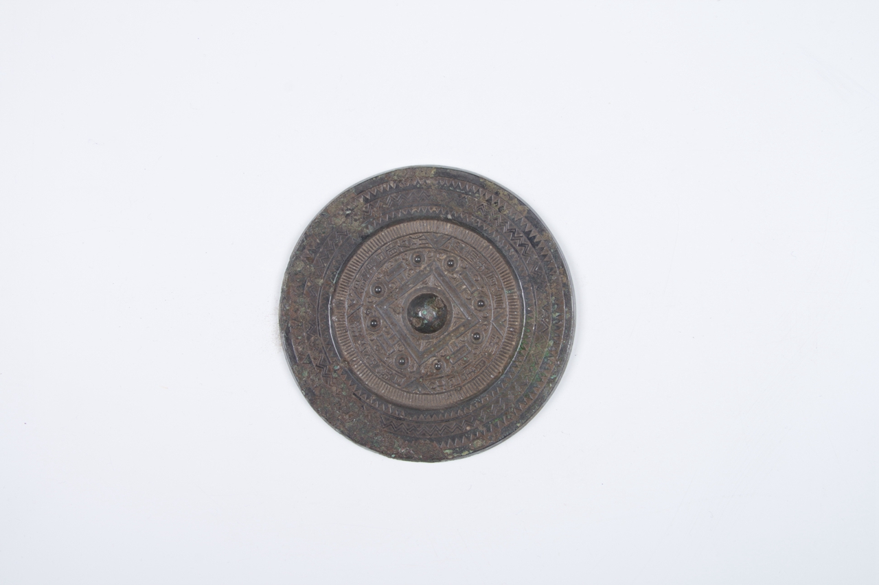 圆钮,方座,内区方座四边各伸出一T字形符号,符号两侧各有一乳。外区四V形符号与方框四角相对。将外区分成四等份,上饰铭文:“新有善铜出丹阳,和以银锡清且明,左龙右虎大真昌”。边缘饰有锯齿纹和水波纹。