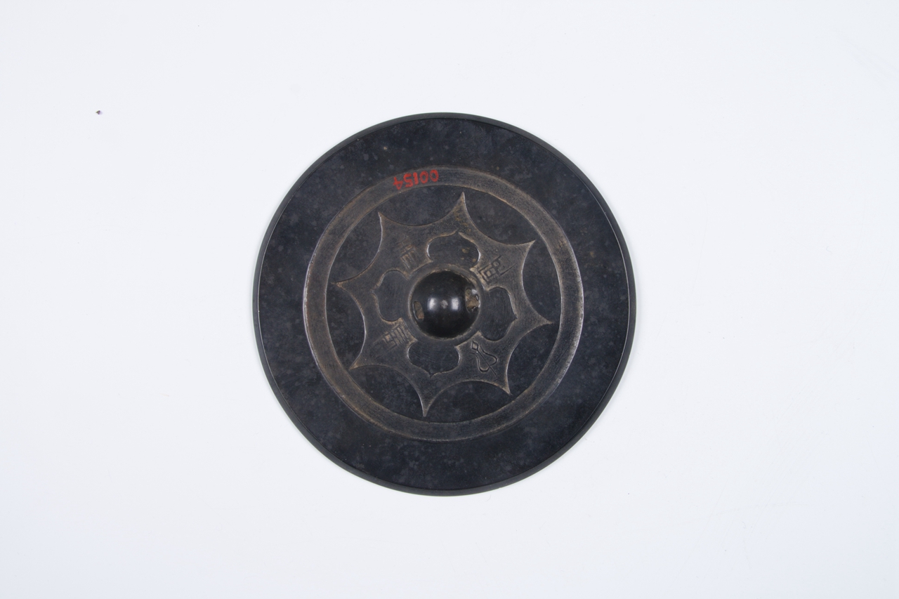 圆形,圆钮,柿蒂纹座,蒂间加“长生宜子”四字铭文。其外为八个向内连弧纹组成的圈带,素宽缘。