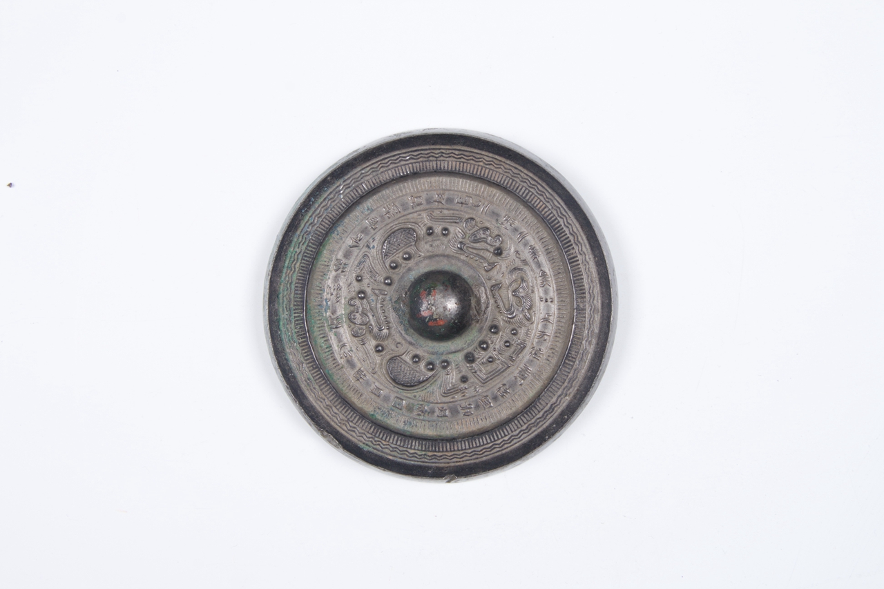 圆形,圆钮,圆座。内区为二龙一虎,外区为铭文带“上方作真佳宜……”。宽缘饰直线短纹,双层水波纹。