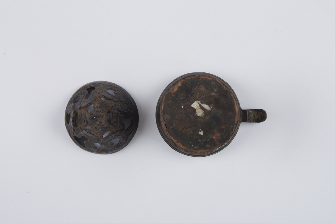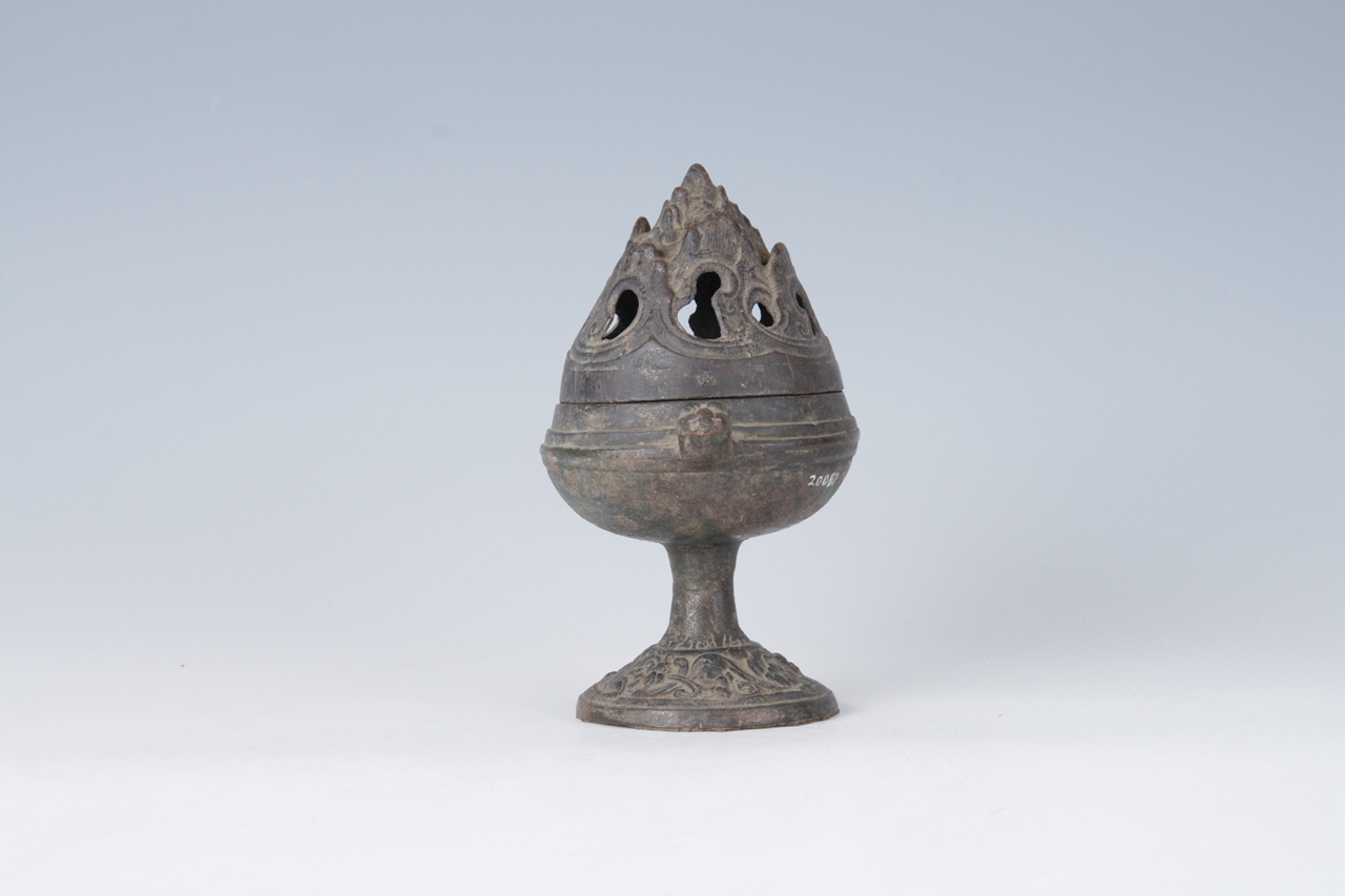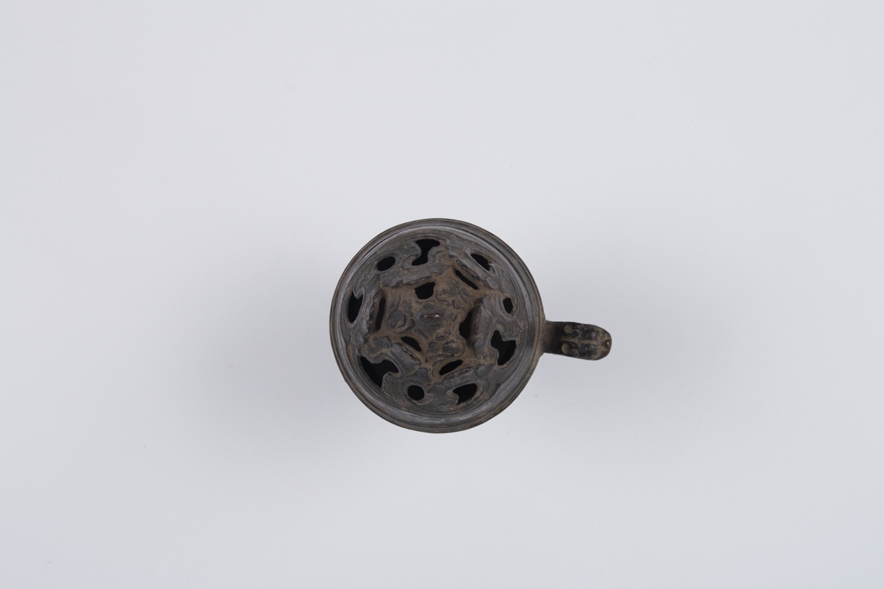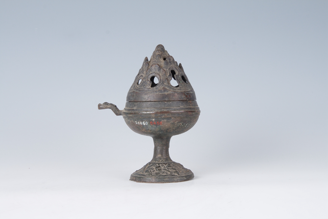 炉体带兽柄,呈半球形。上有镂空的山形盖,圆盘花草纹底座。中有圆柱形柄与炉体相接。