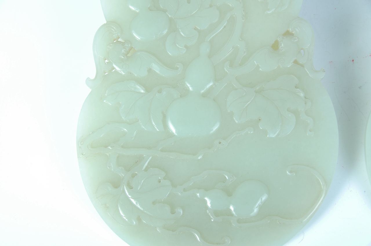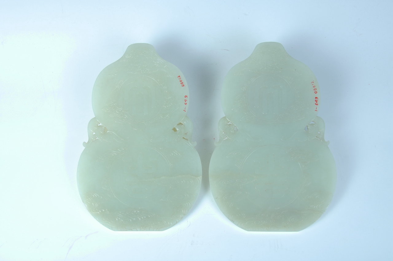 陈设品。正面在扁平葫芦形上浮雕葫芦、枝叶纹,一件雕有四个葫芦,一件雕有三个葫芦,腰两边各透雕一只蝙蝠,背面中部篆书“大吉”二字,周围饰有祥云,寓意“子孙万代、福禄绵长、大吉大利”。