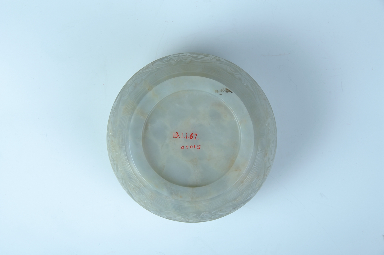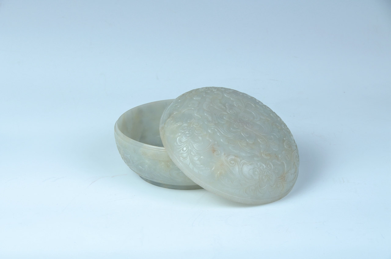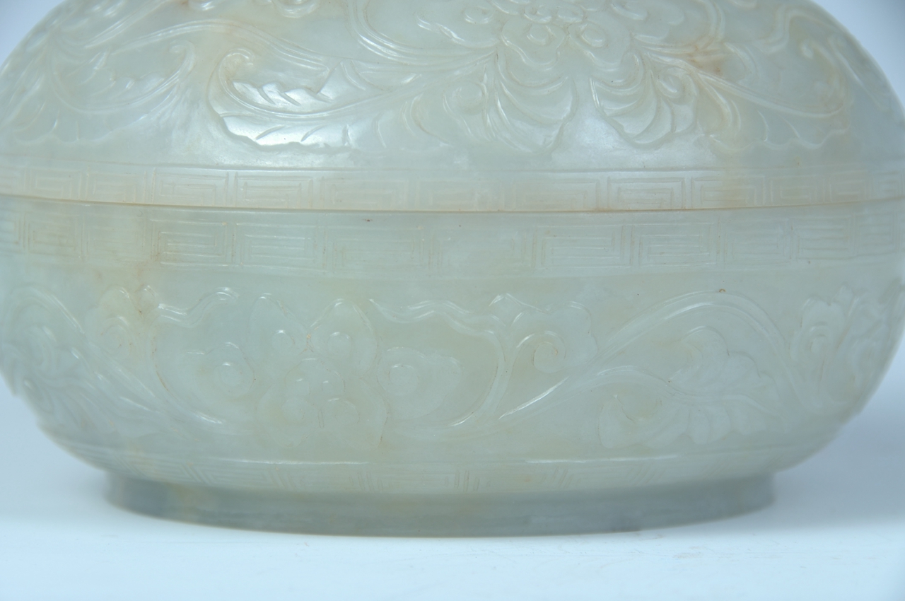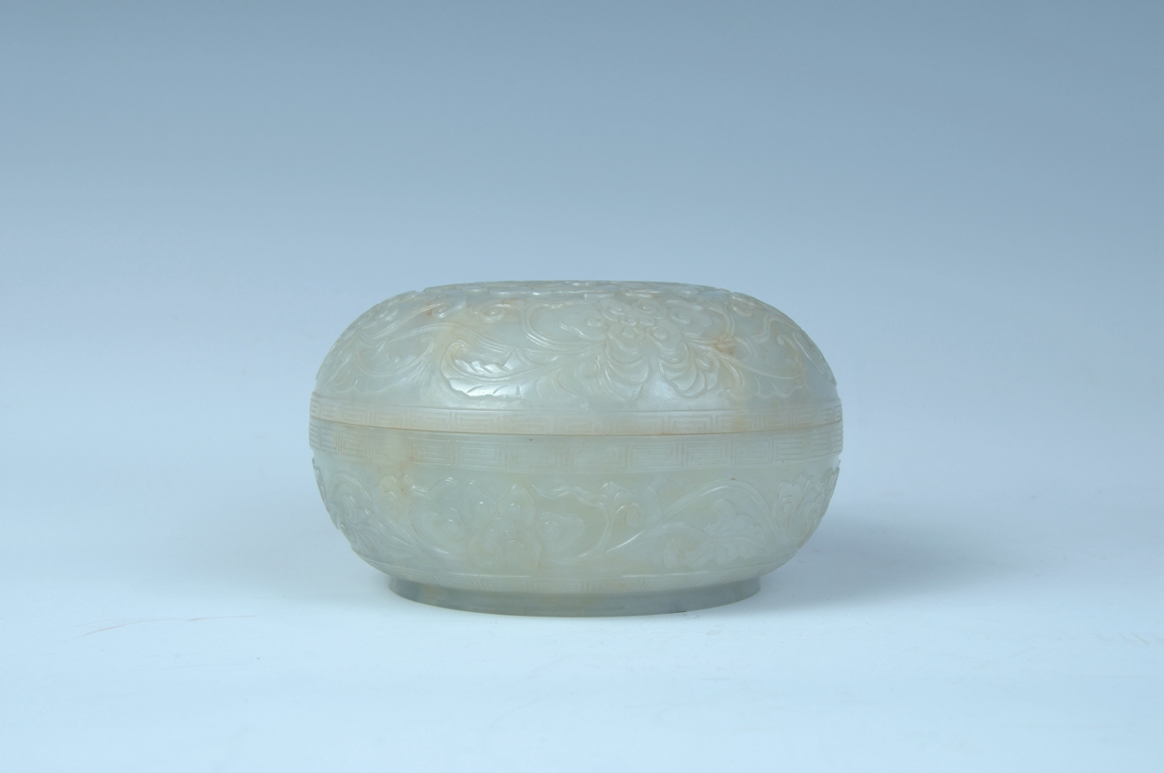 盛器。器呈圆形,由盖、身两部分组成,子母口,矮圈足,通体浮雕缠枝莲花纹。盖边缘、口沿及底部各饰一周回纹。缠枝莲花纹是传统吉祥纹饰,寓意“吉庆”,因其结构连绵不断,故有“生生不息”之意。玉局部有微黄色。