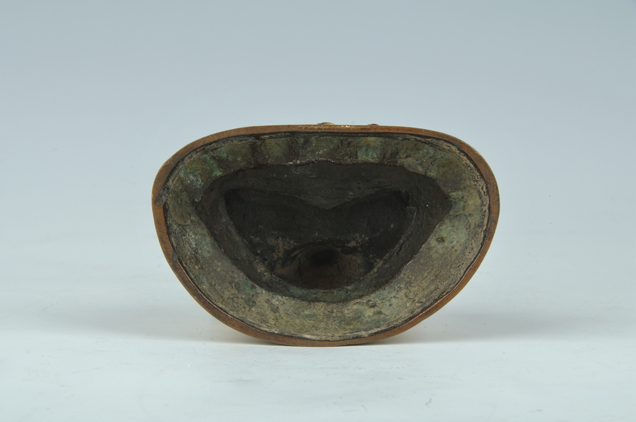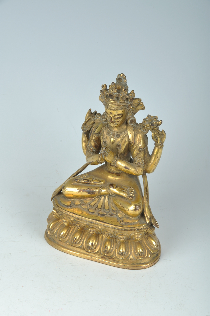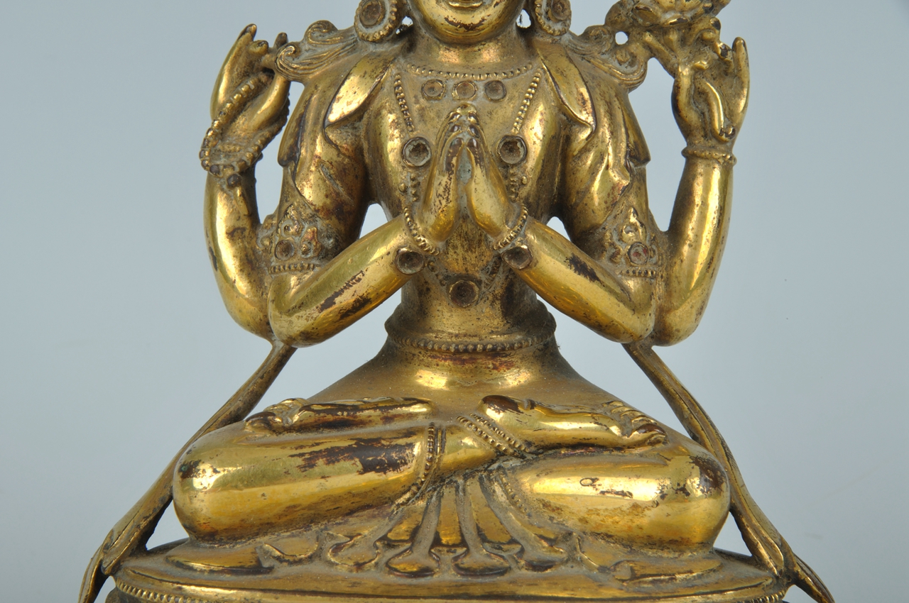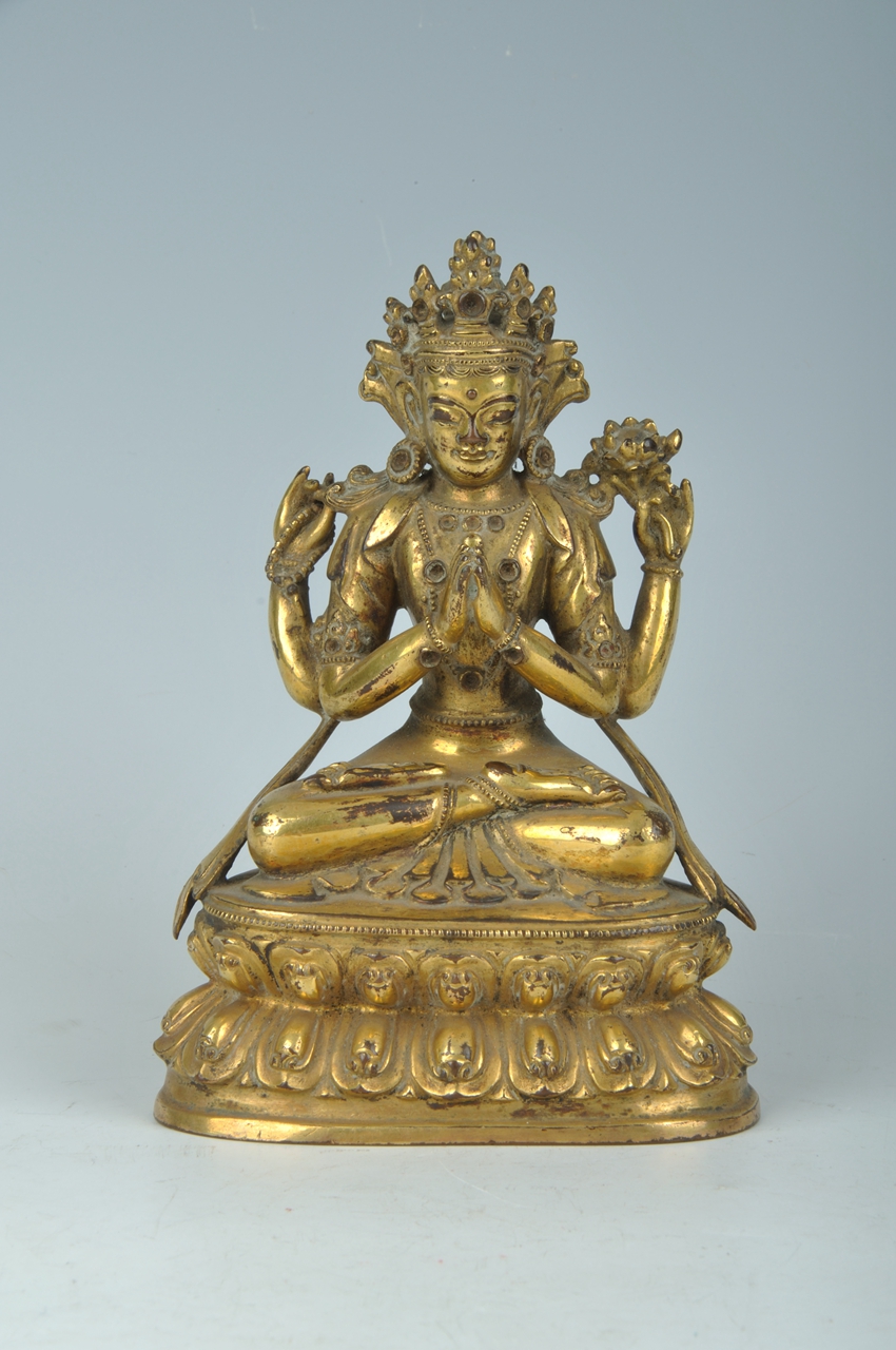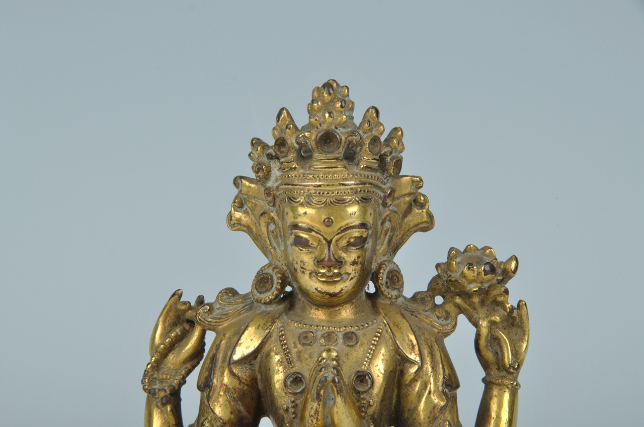 头戴五叶高宝冠,高发髻,长圆脸,丰面。系冠缯带在耳后呈扇形。绀发垂至两肩。胸前佩缨络,四臂饰臂钏和腕钏。肩披天衣,前臂双手合十,后臂屈肘,左手执莲,右手执念珠,下身穿贴身裙,两腿结跏趺坐于莲台上。莲台上层边缘饰一周小方块莲珠纹。正面饰莲瓣,瓣分内外缘,瓣尖饰转珠纹。此像造型端庄,宽肩细腰,做工精简,体表光亮。