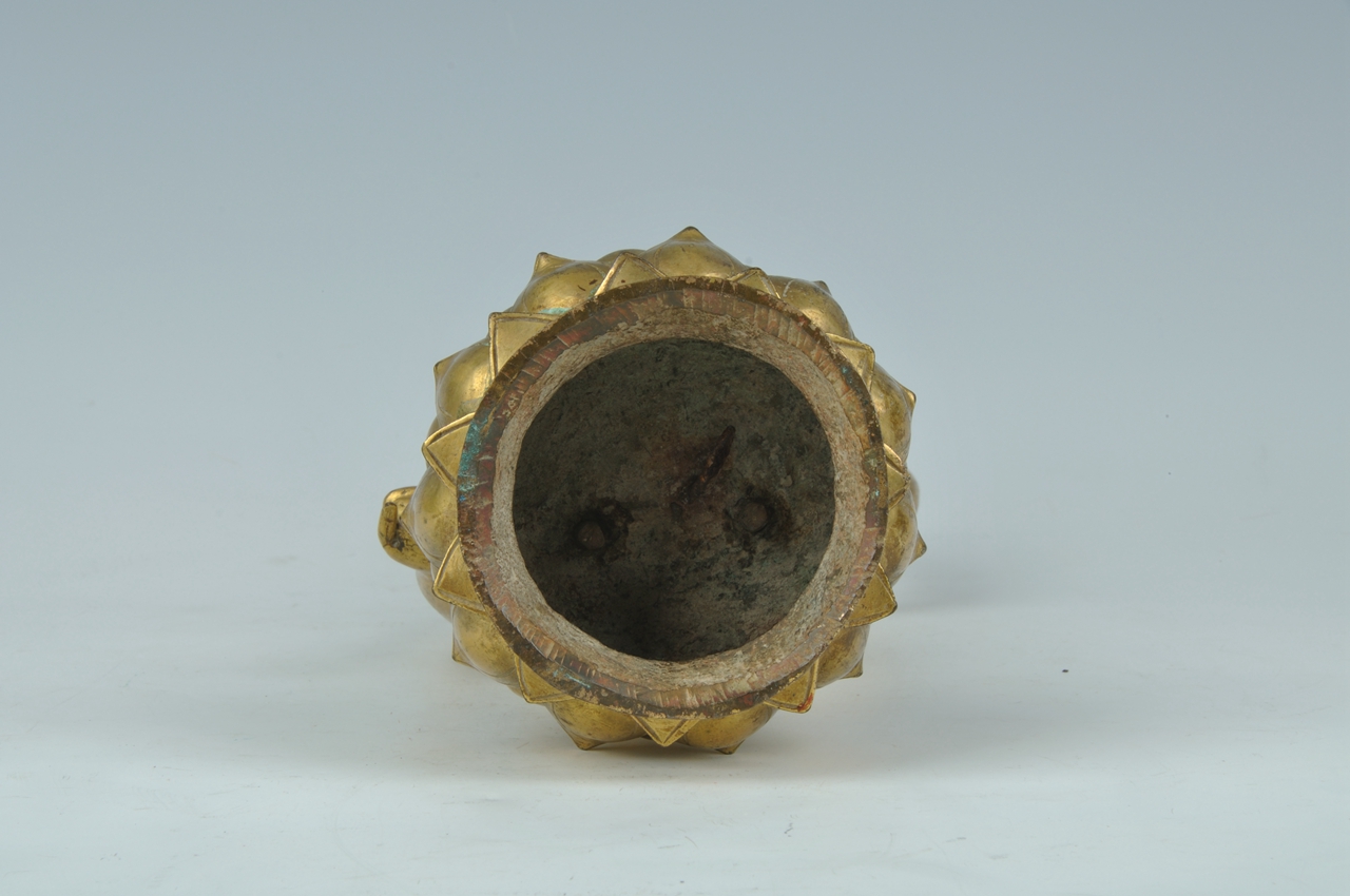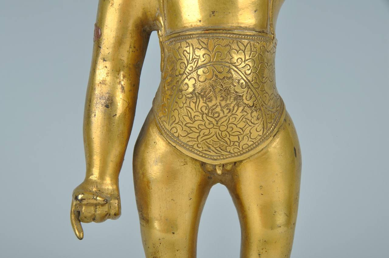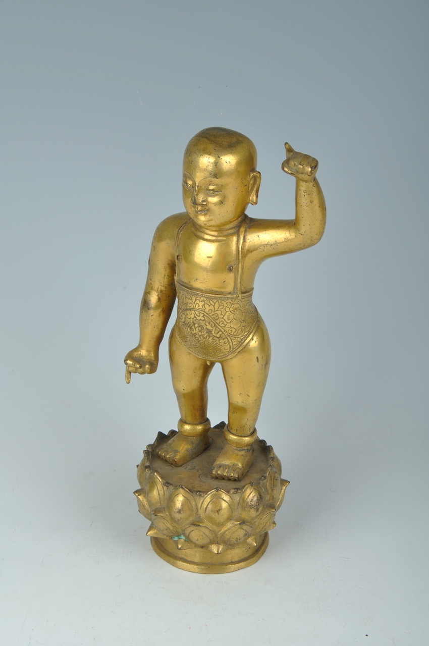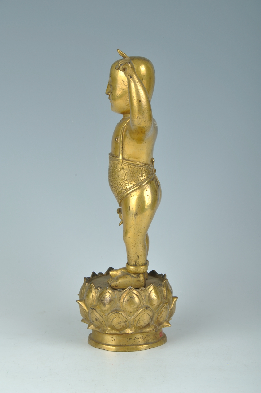僧侣头,方圆脸,童子面。裸身,腹部系一缠枝宝相花纹肚兜。右臂下垂,握拳,食指指地。左臂屈肘上举,握拳,食指指天,双腿直立,脚腕佩戴宽环,环上錾刻有精细的卷叶莲纹。脚下为分体仰式三层瓣叶莲花座。座面刻有阳线方孔圆钱形莲蓬纹。底座部为圈足。通体鎏金。