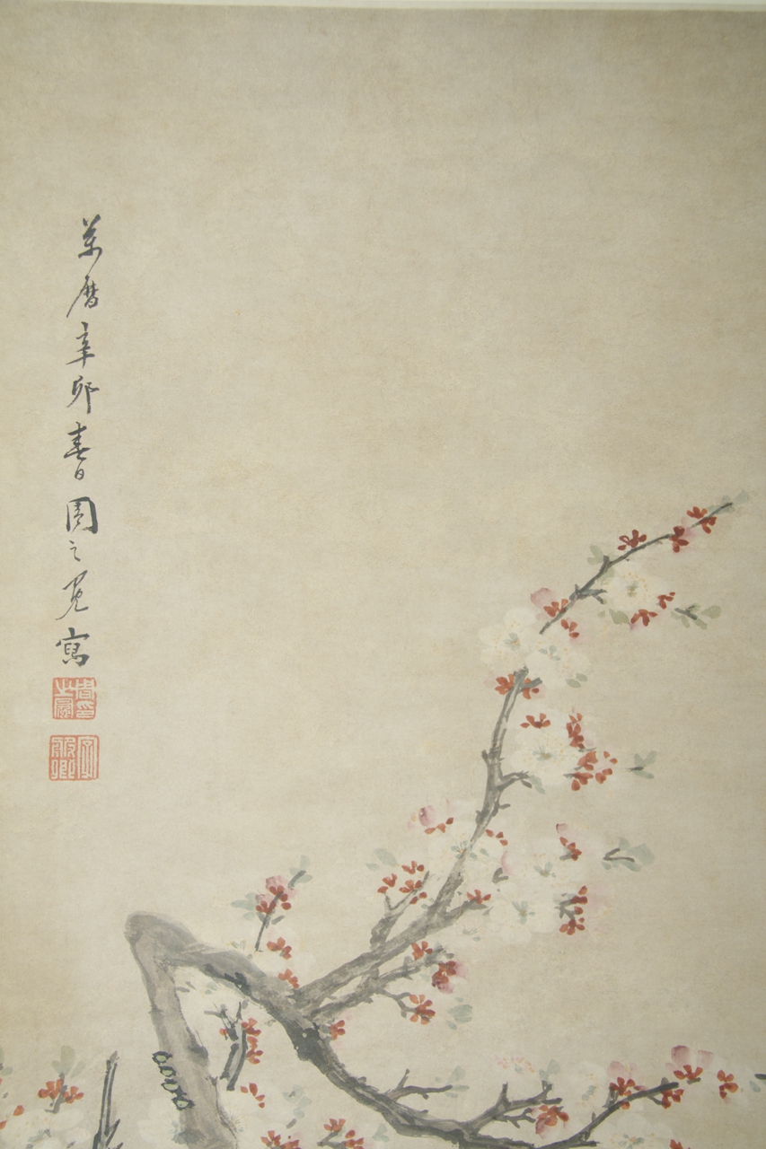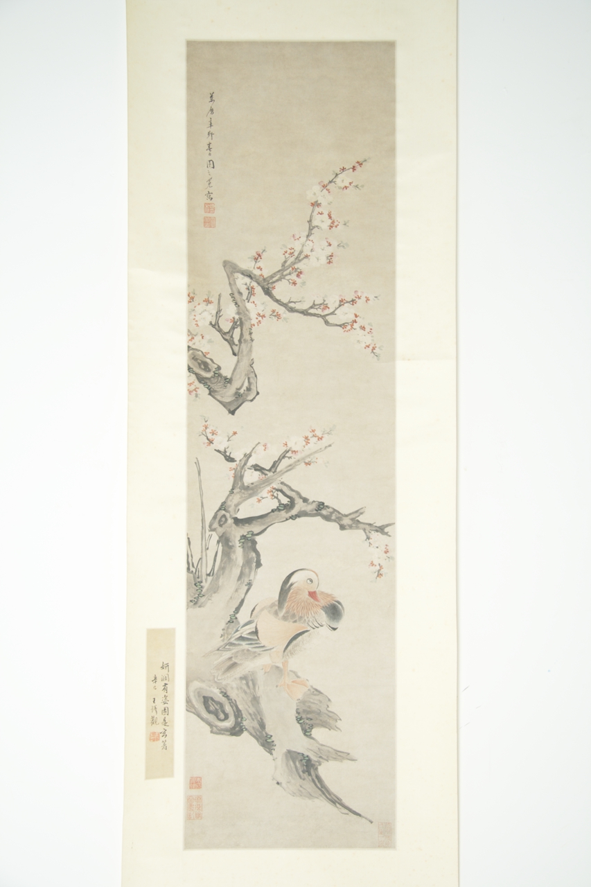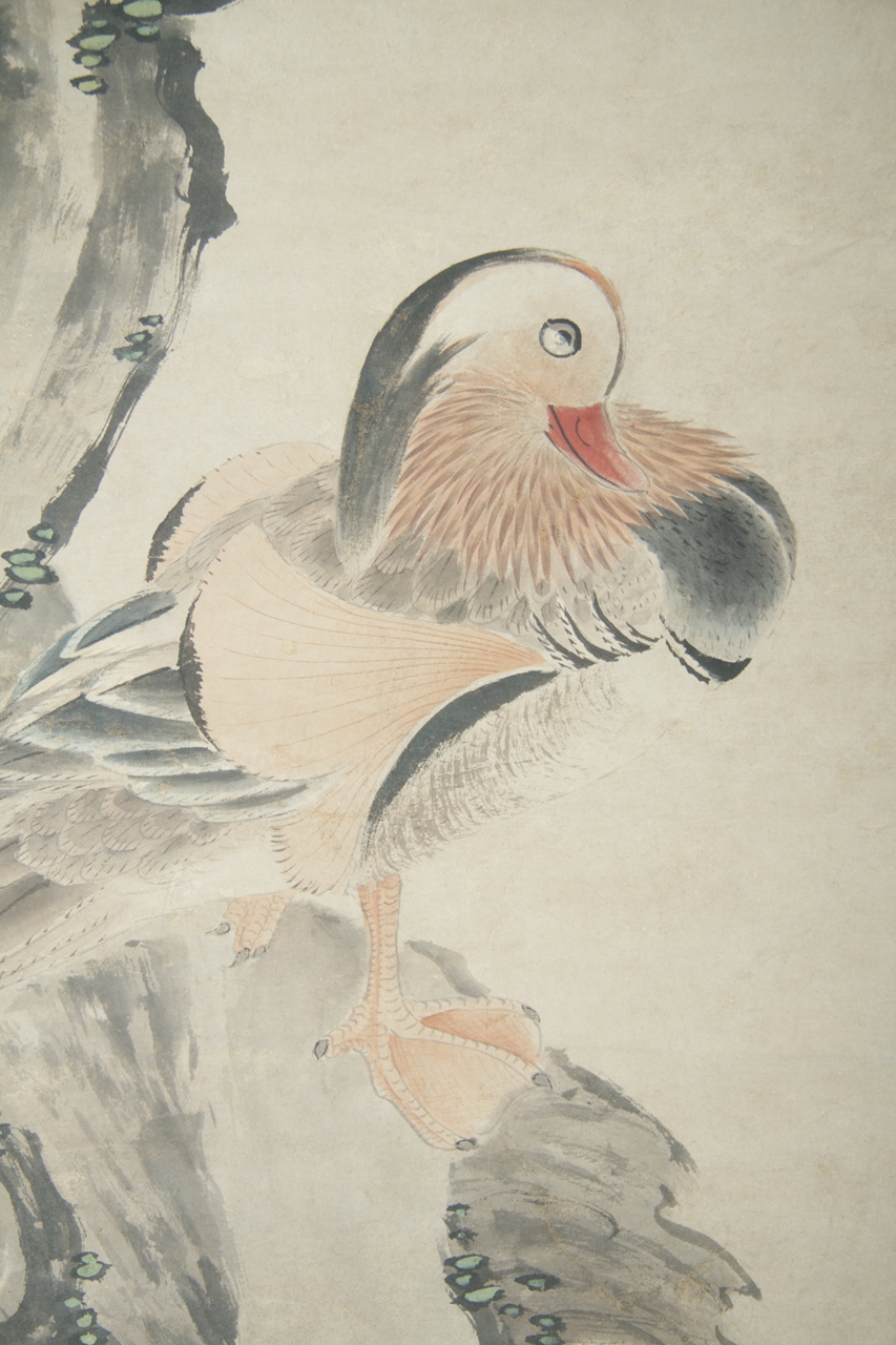 纸本设色杏花孤鸳图轴。近写一只雄鸳鸯面向右端立在一盛开杏花的折枝老干上。它正在含颈梳羽,两眼含情脉脉地注视着前方。它的上方,淡淡的红白色的杏花绽开,处处体现出春意盎然的景象。此图用大笔墨写苍老的枝干,青绿点苔,以点簇法画绽放的杏花;工笔描绘鸳鸯的含情之态,逼真而生动,整个构图虽未画水,却给人以春水涟漪的感觉。左上角题“万历辛卯春日周之冕写”,钤白文“周之冕印”、“字服卿”二方印。