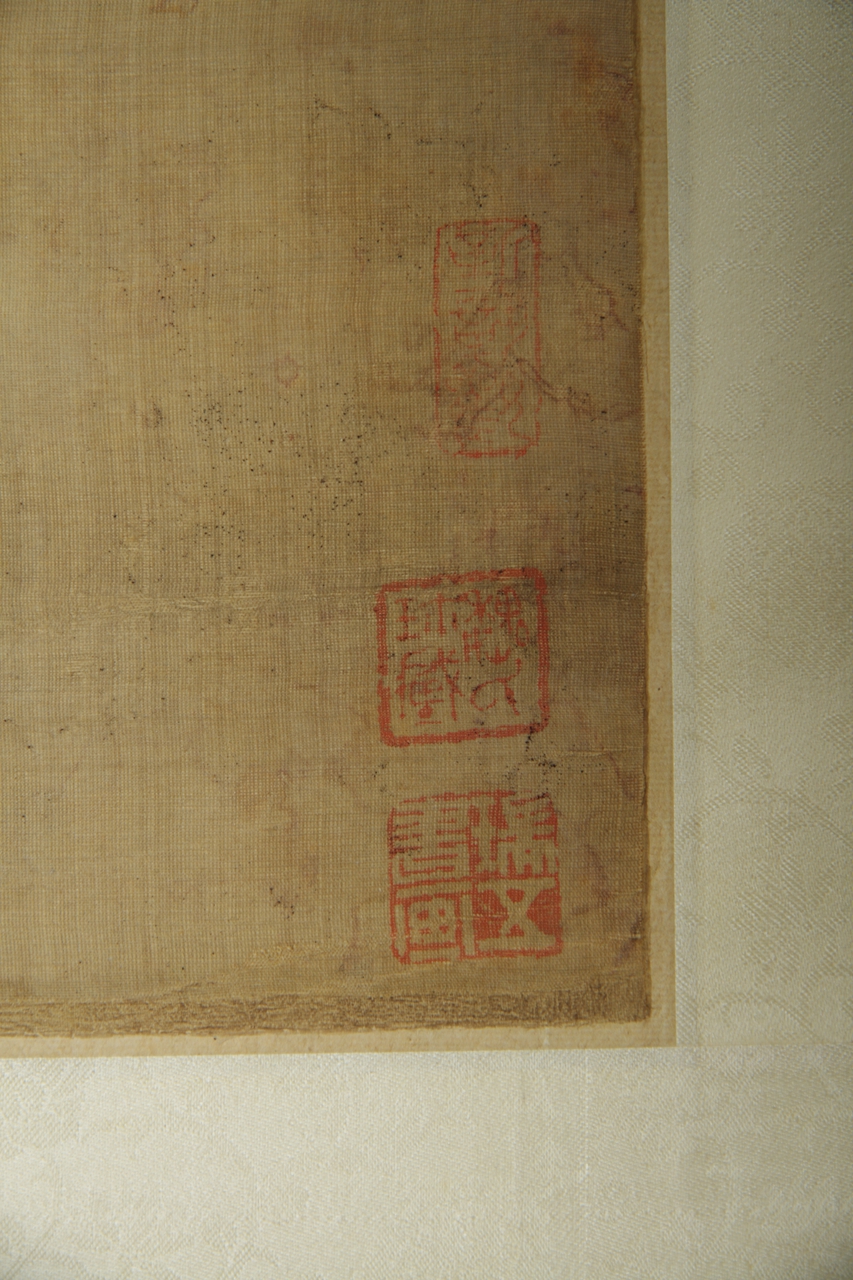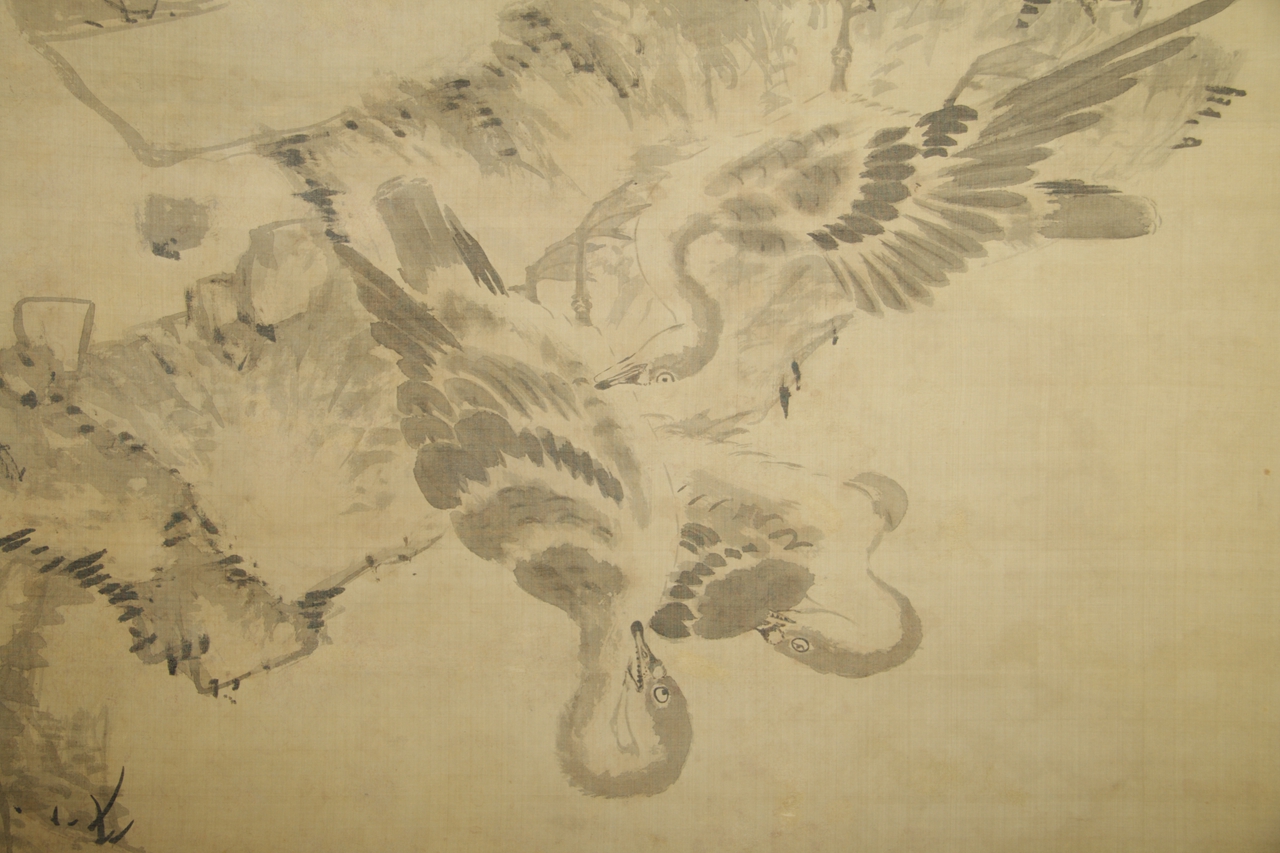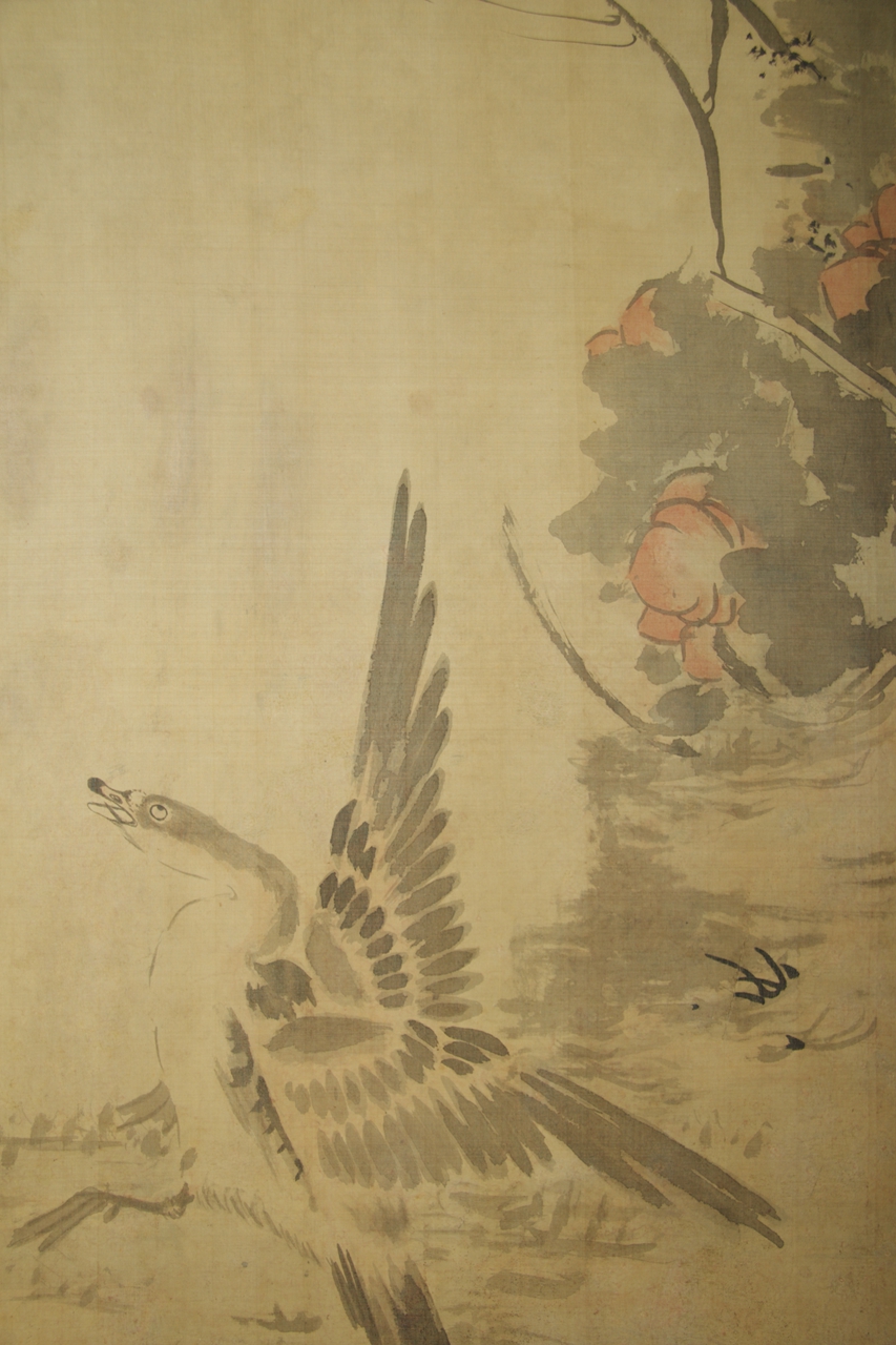 绢本设色芦雁荷花图轴。绘悬崖巨石下,四只芦雁飞鸣聚止在苔藓点点的岸石之上,形态各异,前有落地收翅,后有含颈梳羽的,上有展翅鸣叫的,四雁眼珠均翻向上方,顶部崖下悬垂三朵红色荷花和数枝折芦。整图意境清寒,右落“八大山人写”,钤白文“八大山人”、朱文“何园”二方印。