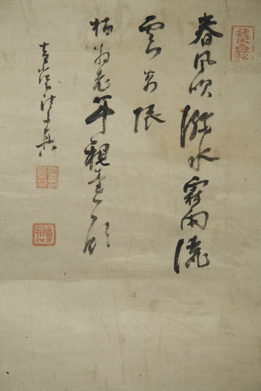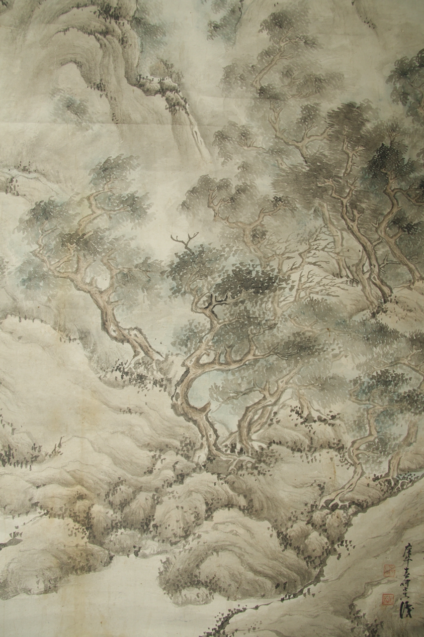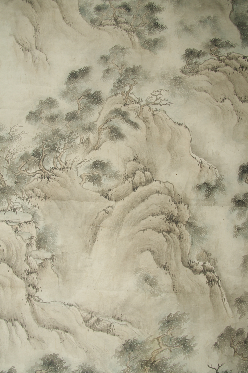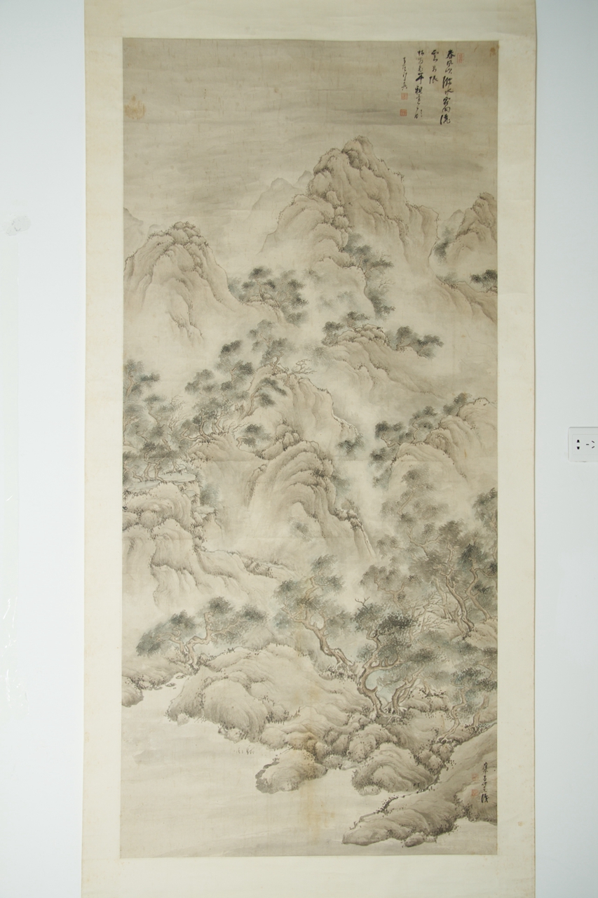 纸本浅绛设色云松图。整幅画山势嵯峨,群峰拱立,岩岫鳞次,苍松、古树布满各个山头,画面似狂风扫过群山,所有树木皆偏倒向右。山峰之上,均用墨笔点苔,渲染苍郁之气。山间雾气蒸腾,画面朦胧迷茫,似山雨飞浓。山间隐约有飞瀑潺潺,汇注成潭。右上自题“春风吹□水,霖雨洒云□,□柏翁老年案台一顾,黄山法若真。”钤“法若真印”白文、“黄□氏”朱文二枚方印。右下另题“庚午春仲七十八识”,钤“法若真印”白文方印、“黄石氏”朱文方印。
