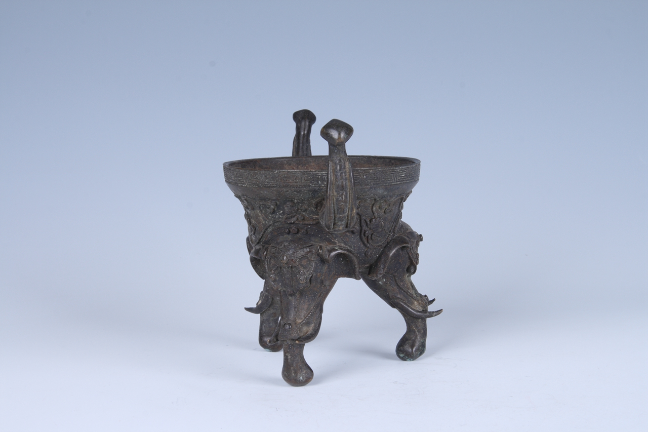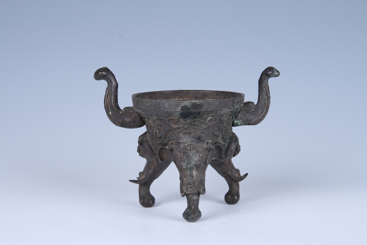 器物造型优美,圆口,短颈,口颈部浮雕云雷纹。对称两象鼻形耳。深腹外鼓,饰有吉瑞花卉纹饰。分裆式实心象形足,三象首气势威猛。