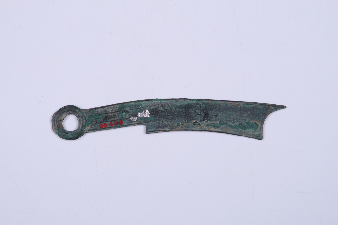此币弧首、弧刃,弧背。刀体外缘有廓。刀柄双面均有竖纹二道,柄端为环形。刀面模铸篆书“即墨之法化”五字钱文。背面上部有三横纹,中有“1”形符号,下有“大行”二字铭文。“即墨”齐国城邑名。此刀应是春秋战国时期齐国刀币。