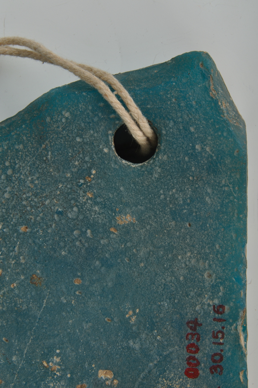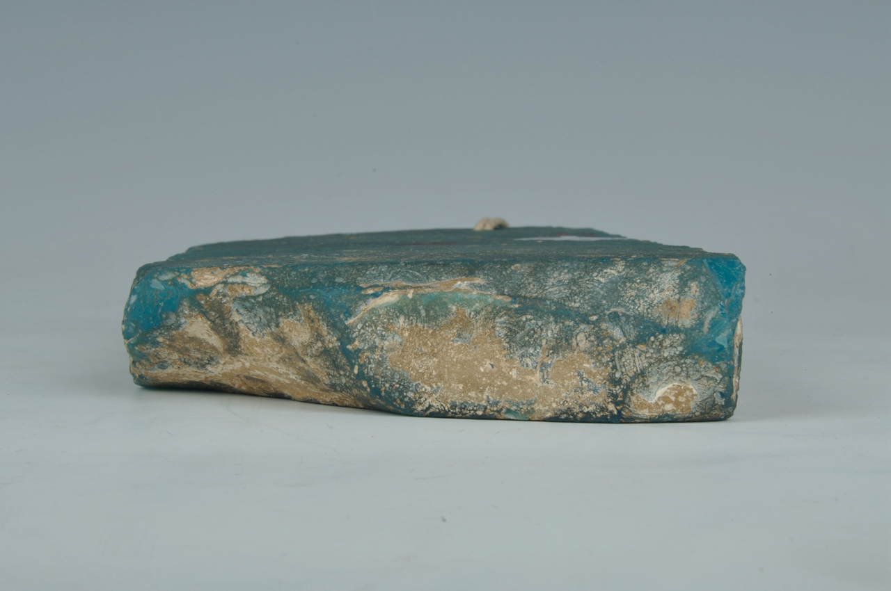 古代乐器。此琉璃磬呈不规则长方形,天蓝色。一端钻有一马蹄孔,可系绳悬挂。通体光素无纹。一面有土沁。