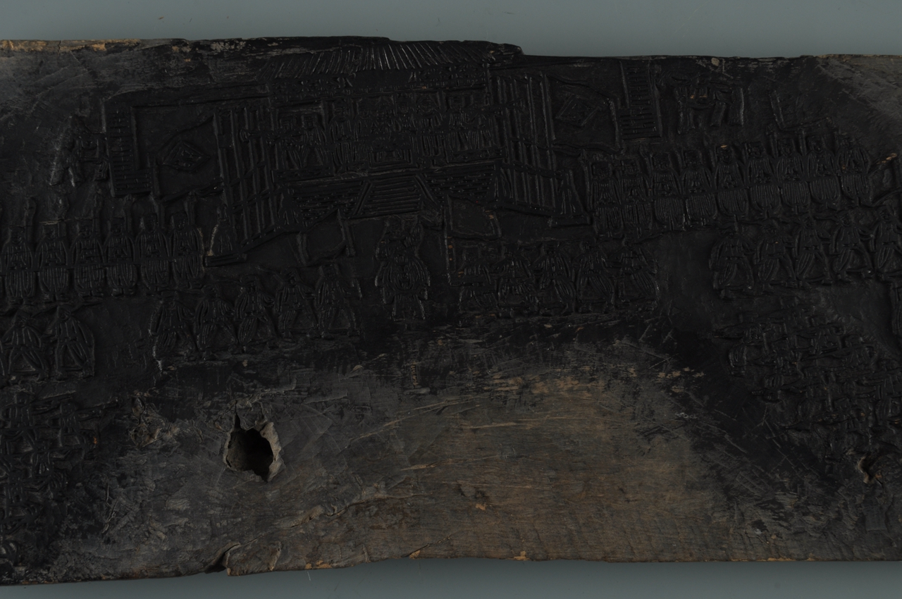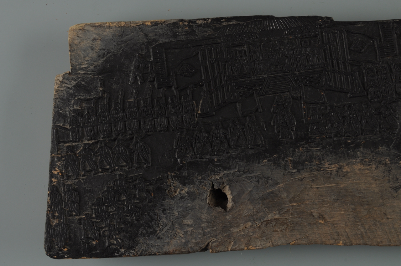 长方形木板,浮雕图案呈扇形分布。表现将士武备操练场面,中部殿堂内,将官端坐阅兵,操练场中间,一将军骑马指挥,众士兵均严阵以待,或举旗、或扛枪、或执戟,人物众多,井然有序。此题材较为少见。