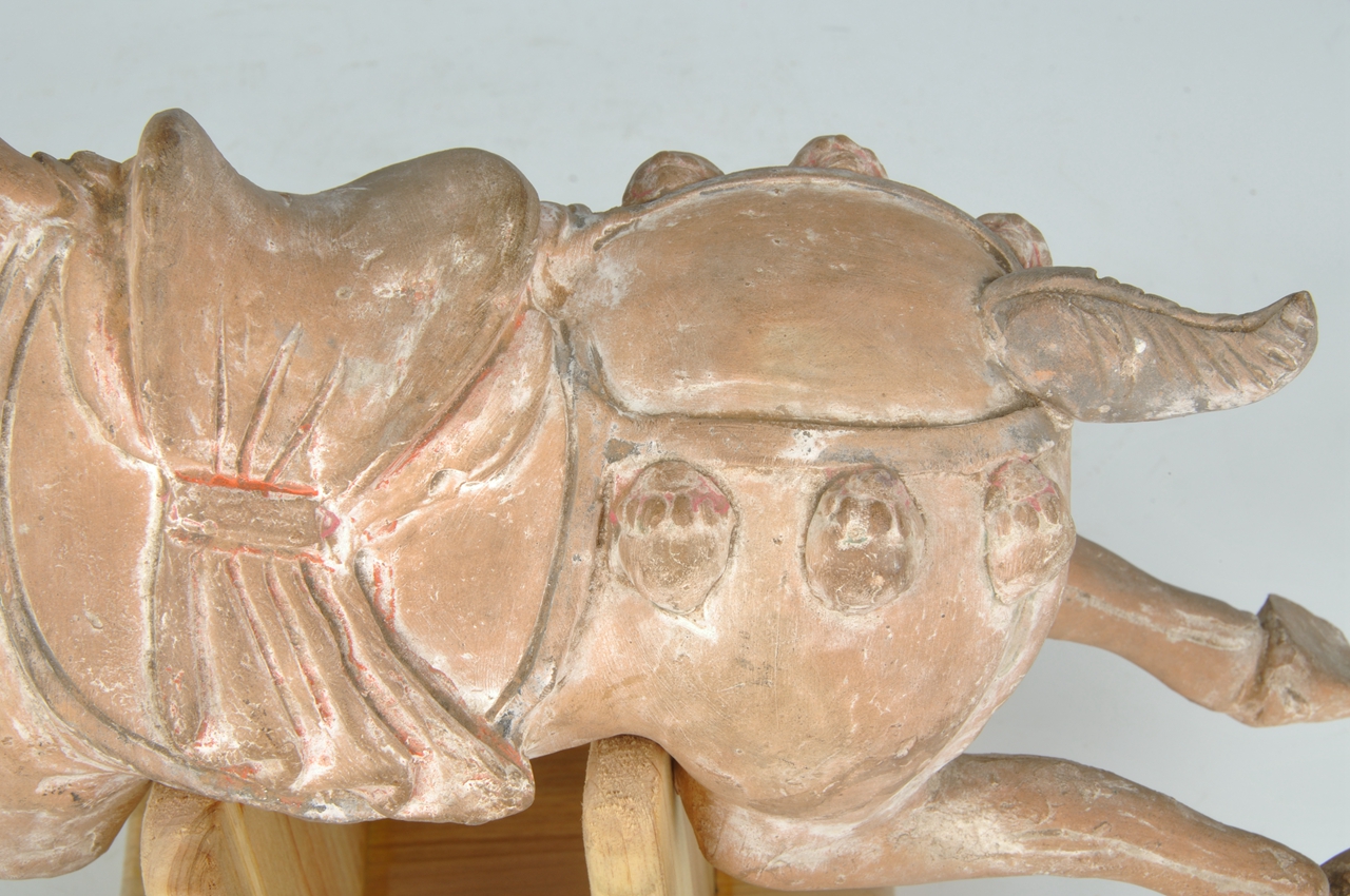 泥质褐陶,马耳竖立,马头转向左边,双目圆睁,剪鬃缚尾,昂首嘶鸣,马背上有马鞍,马尾粗短上翘。腹部中空,四蹄腾跃,做奔跑状,栩栩如生。