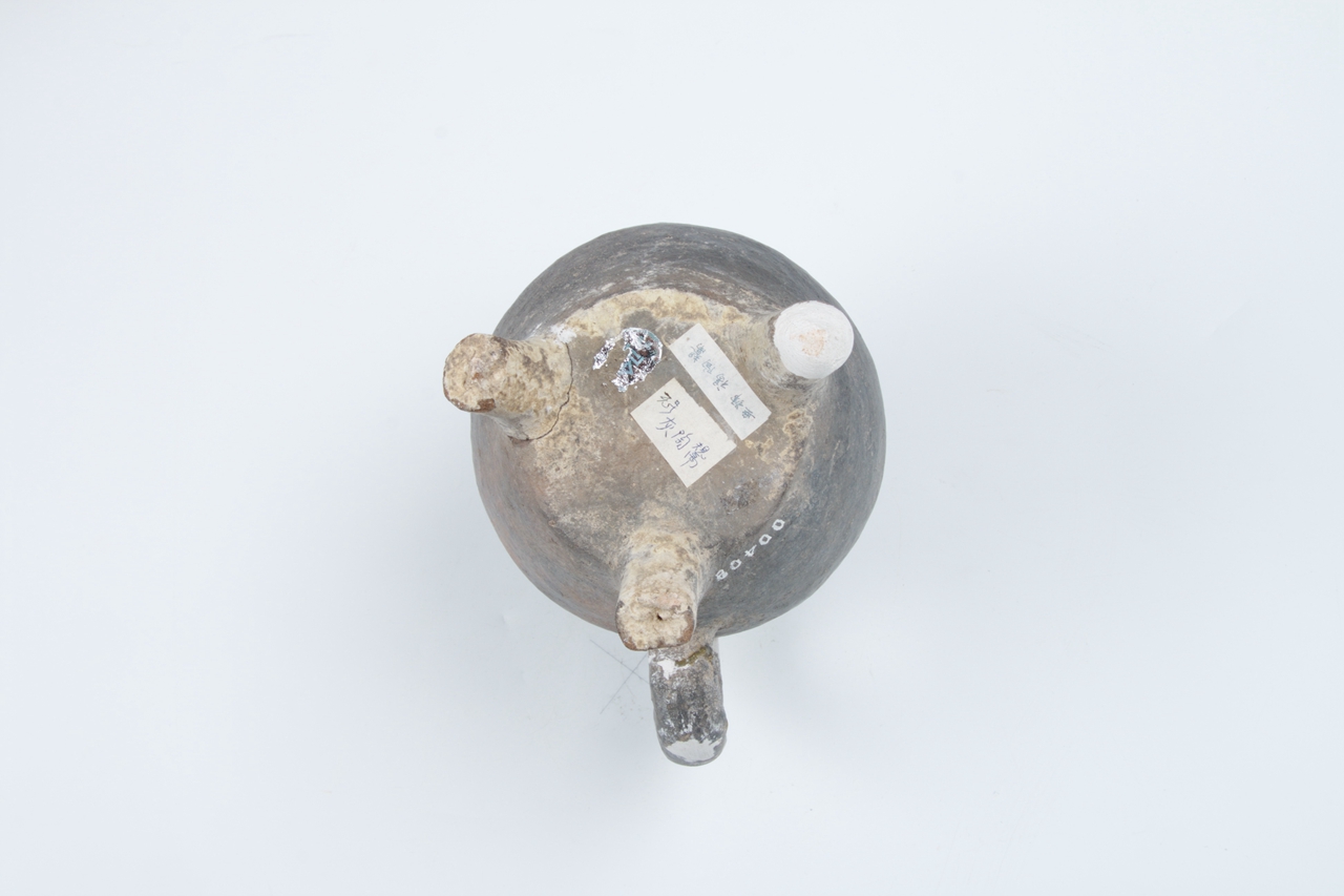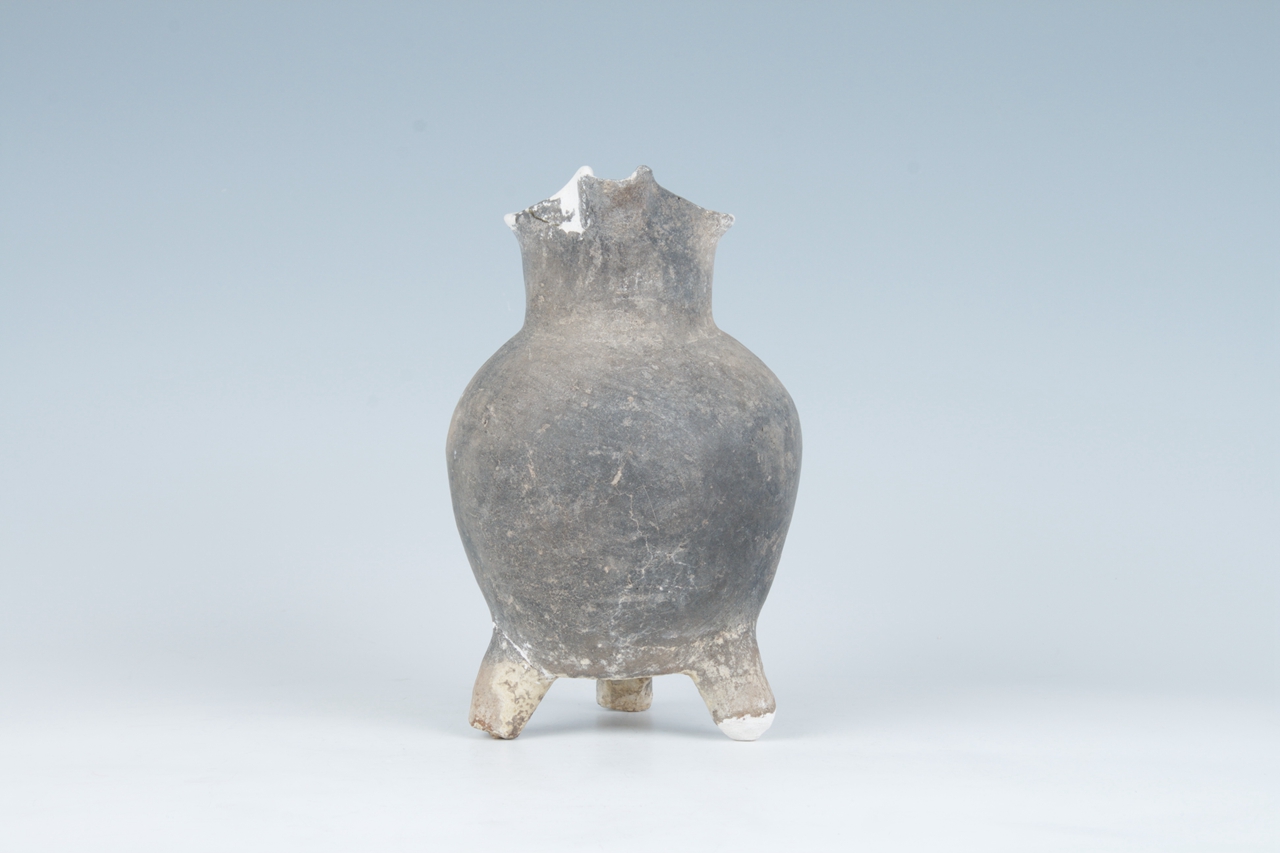 1979年青岛胶州三里河出土。大汶口文化的陶鬹,为煮水器皿。泥质灰陶,侈口,短颈且直,折肩鼓腹,小平底下附三个锥形足。脊背饰绳纹鋬于颈腹之间。其造型朴实,浑厚规整,富有地方特色。