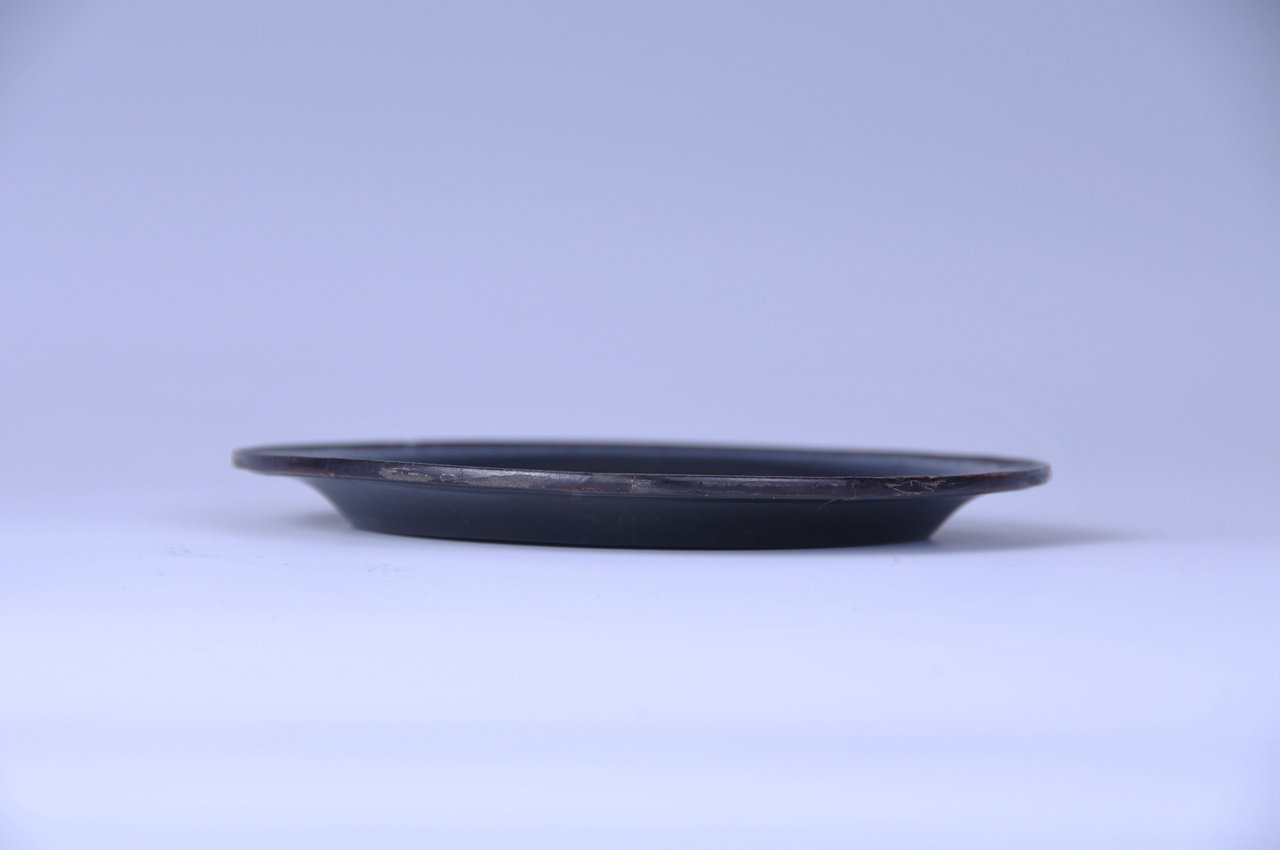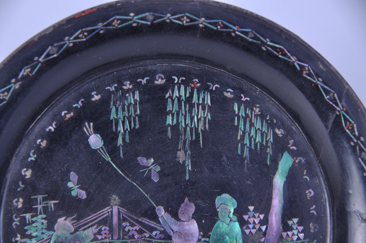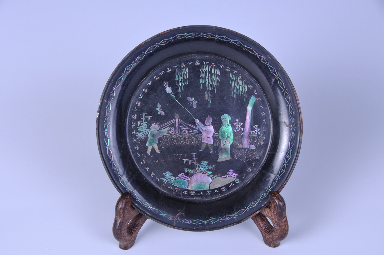 盘为圆形,木胎,整器髹黑漆,宽平沿,沿面用细钿丝嵌成菱形几何纹,盘中部螺钿镶嵌出庭院人物图,宽阔的庭院中,垂柳山石,细草飞蝶,两位顽童正欢快地放风筝,旁边站立一位盘髻仕女,广袖长裙,和颜悦色地望着两位孩童。螺钿闪现五彩色泽。外盘底中心方格内嵌“千里”二字。