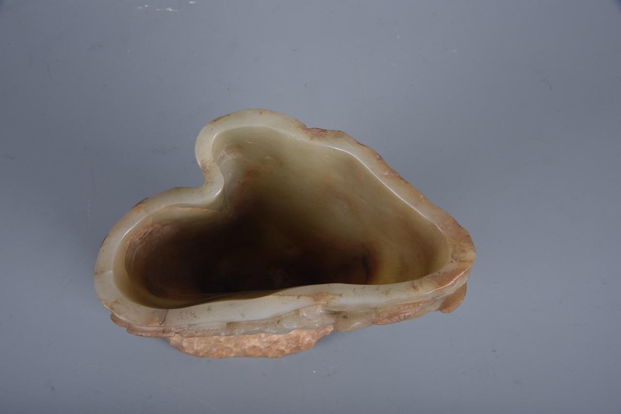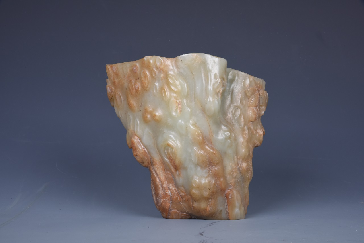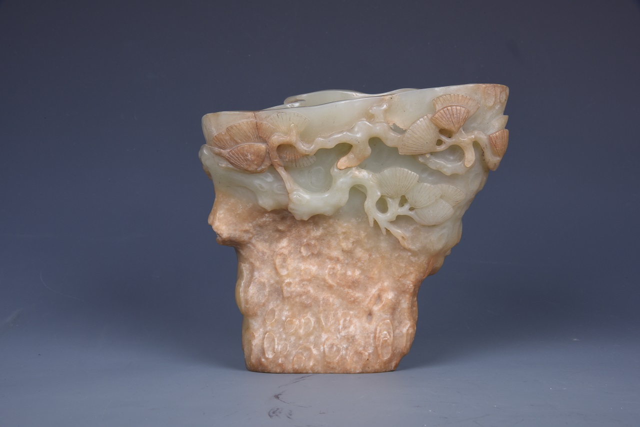 青玉根料。通体呈一节不规则古松树枝干形状。花插上部正面为青玉浮雕松树枝叶,部分枝叶由褐黄色玉皮雕成。中下部利用青玉及黄褐色根料巧雕为松树根枝,树皮,结节雕琢清晰逼真。