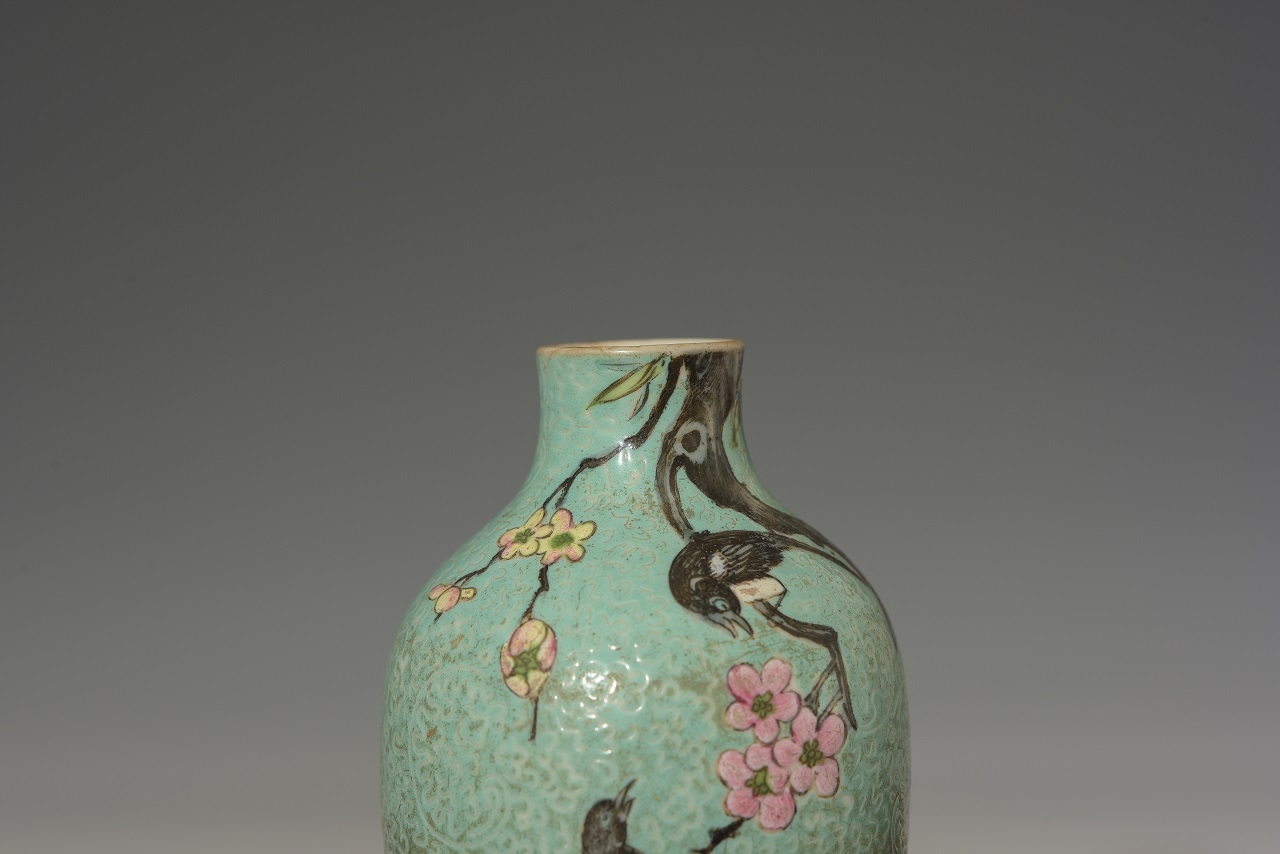 藏品年代:清乾隆藏品尺寸:高:12.8厘米,口径:2.5厘米,底径:3.1厘米,腹:7厘米藏品质地: