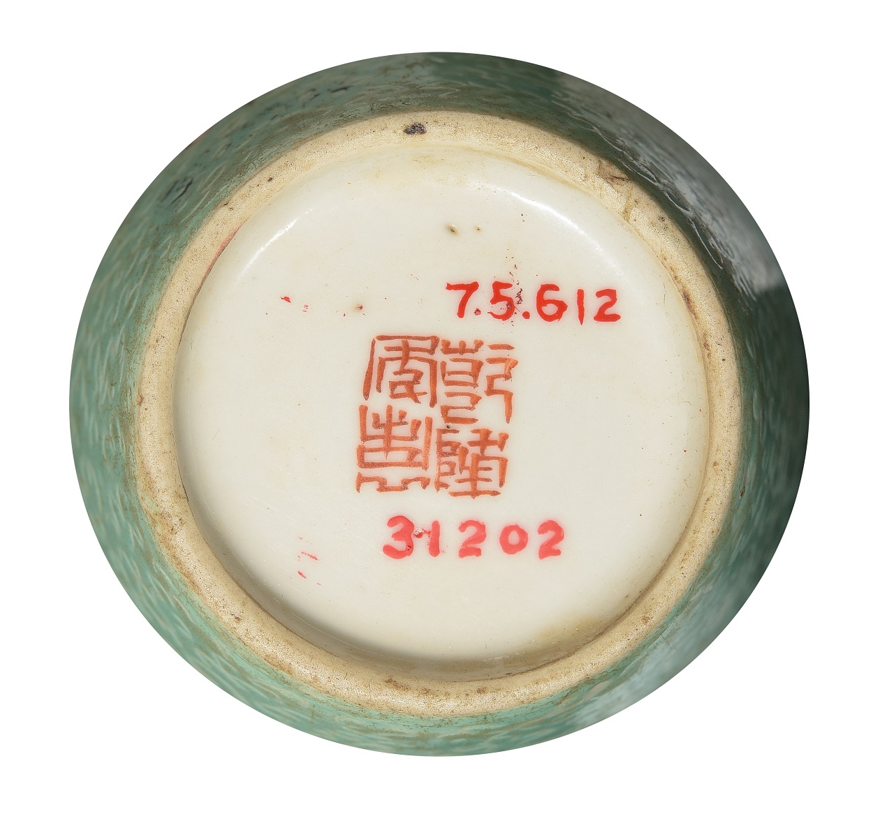 平口,短颈,外壁为粉绿地,有轧道纹饰,并绘有喜鹊登梅枝吉祥图。壁内施白釉,底部微凹施白釉,书有“乾隆年制”四字红彩篆书款,足露胎。