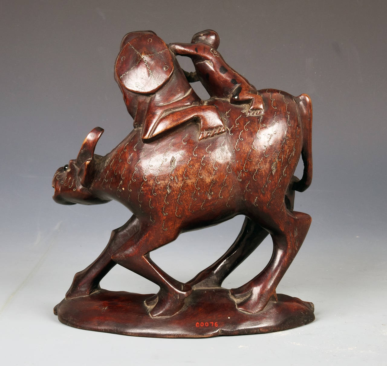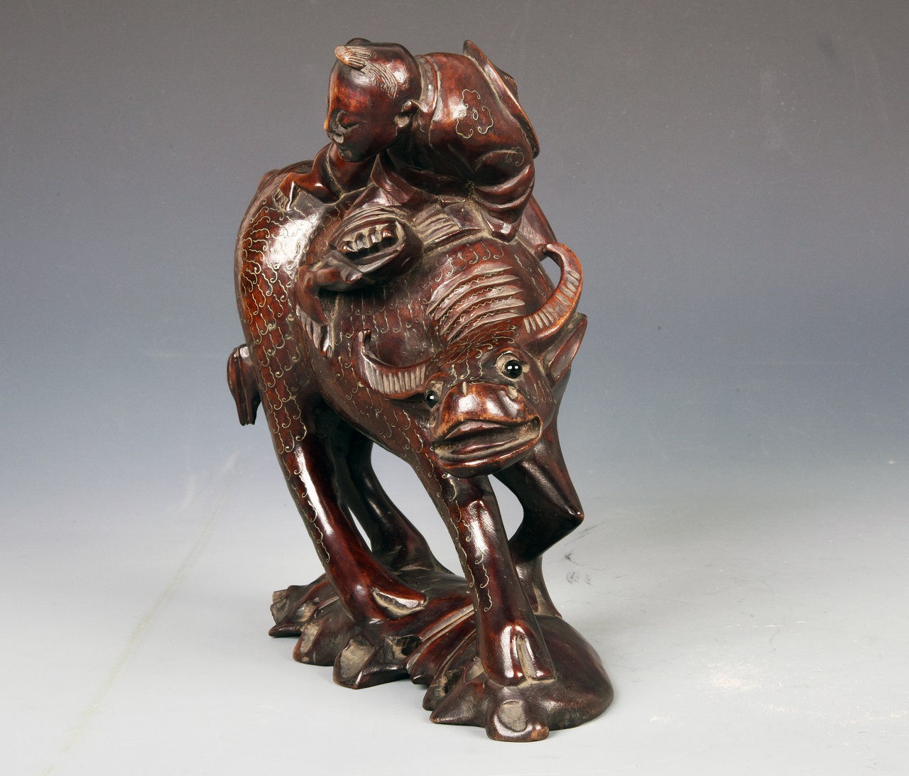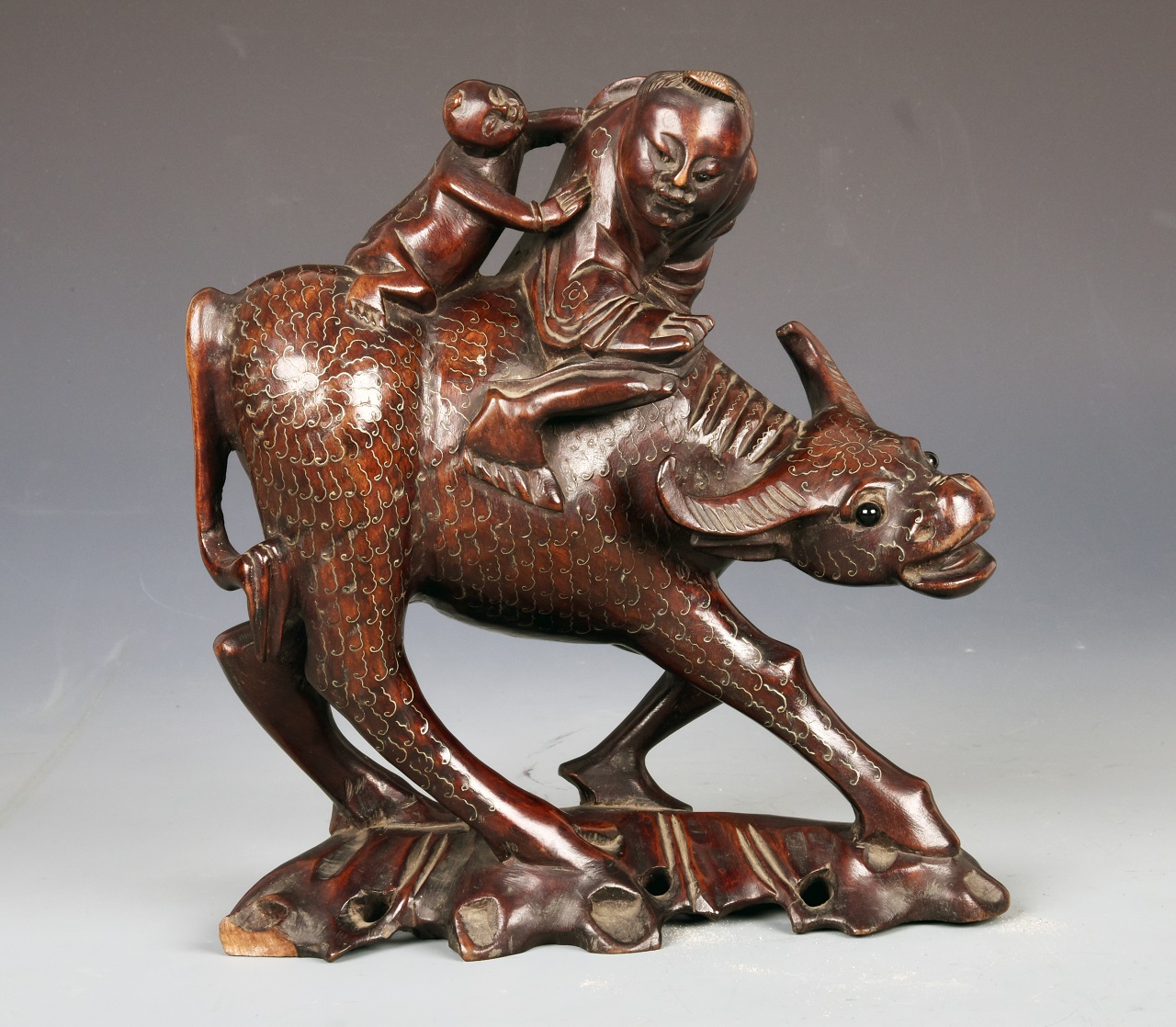 此对牧童骑牛主题的木雕为红木所制,木质呈深枣红色,牛背上骑着大小二童嬉戏玩耍。牛呈行走状,神态逼真,身体前倾,全身所嵌银丝表现牛毛的纹路和衣服花纹。近看牛头平直、两眼目视前方,膘肥体壮,四肢有力,毛纹清晰柔顺,形态自然、生动;远望则具有红铜雕塑质感,整件造型生动,形神兼备、做工细腻、富有生活气息。