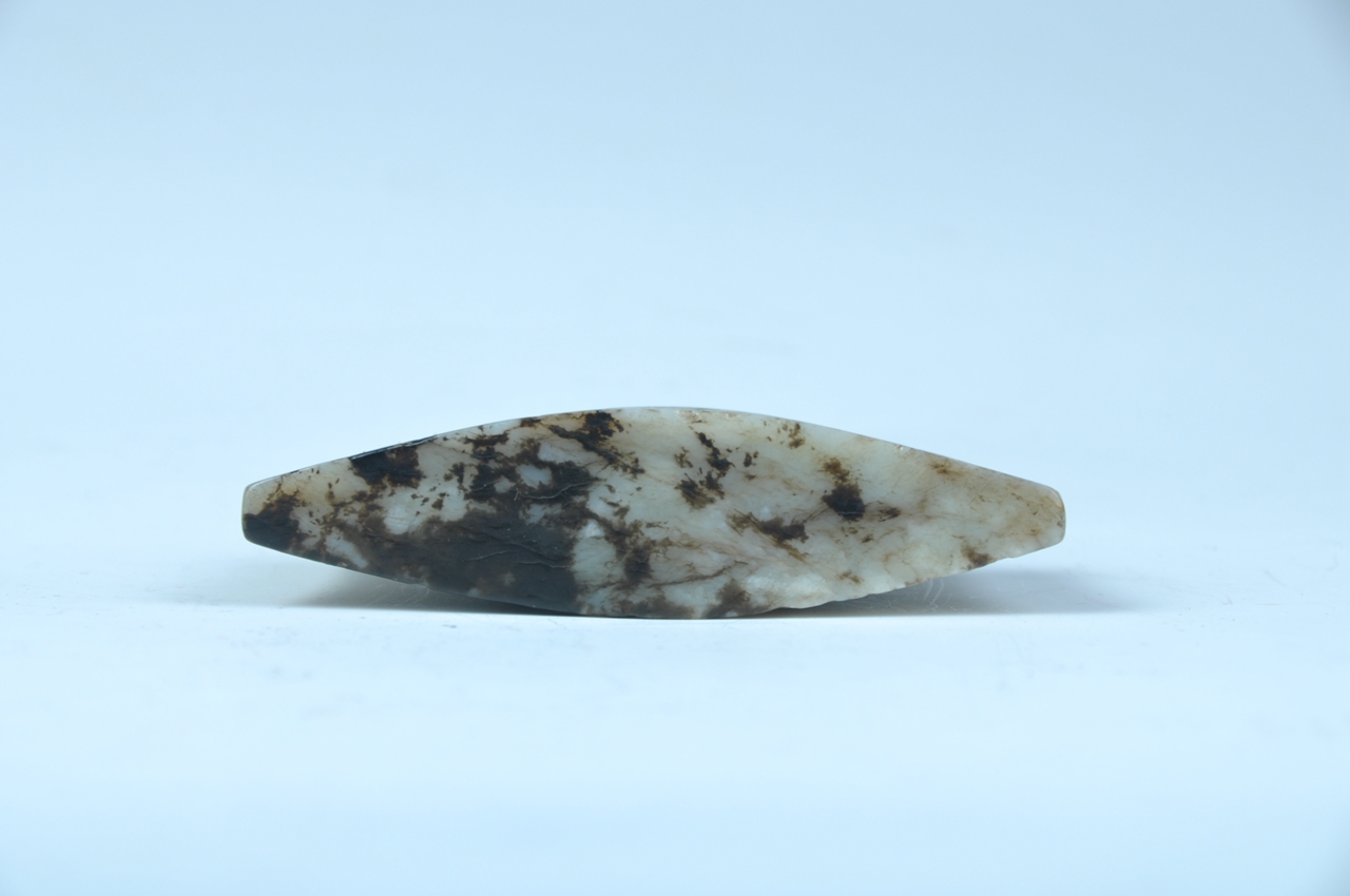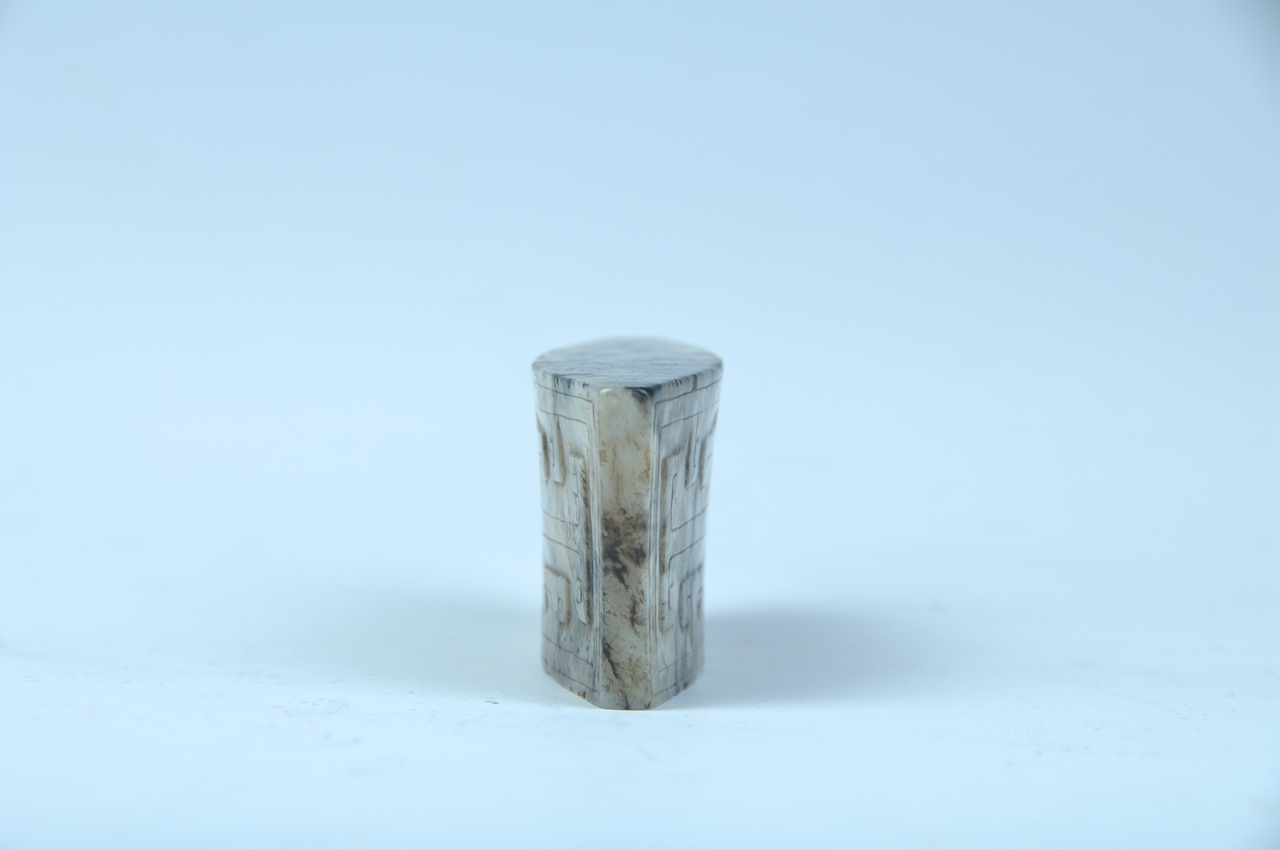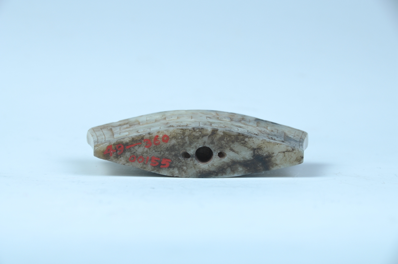 玉剑珌,又作玉剑摽,装缀在剑鞘末端。玉质温润,局部有黑褐色沁。呈缩腰梯形,剖面为橄榄形,两面浮雕勾连云纹,窄端一面有孔,便于与鞘身相连,雕琢纹饰规整。