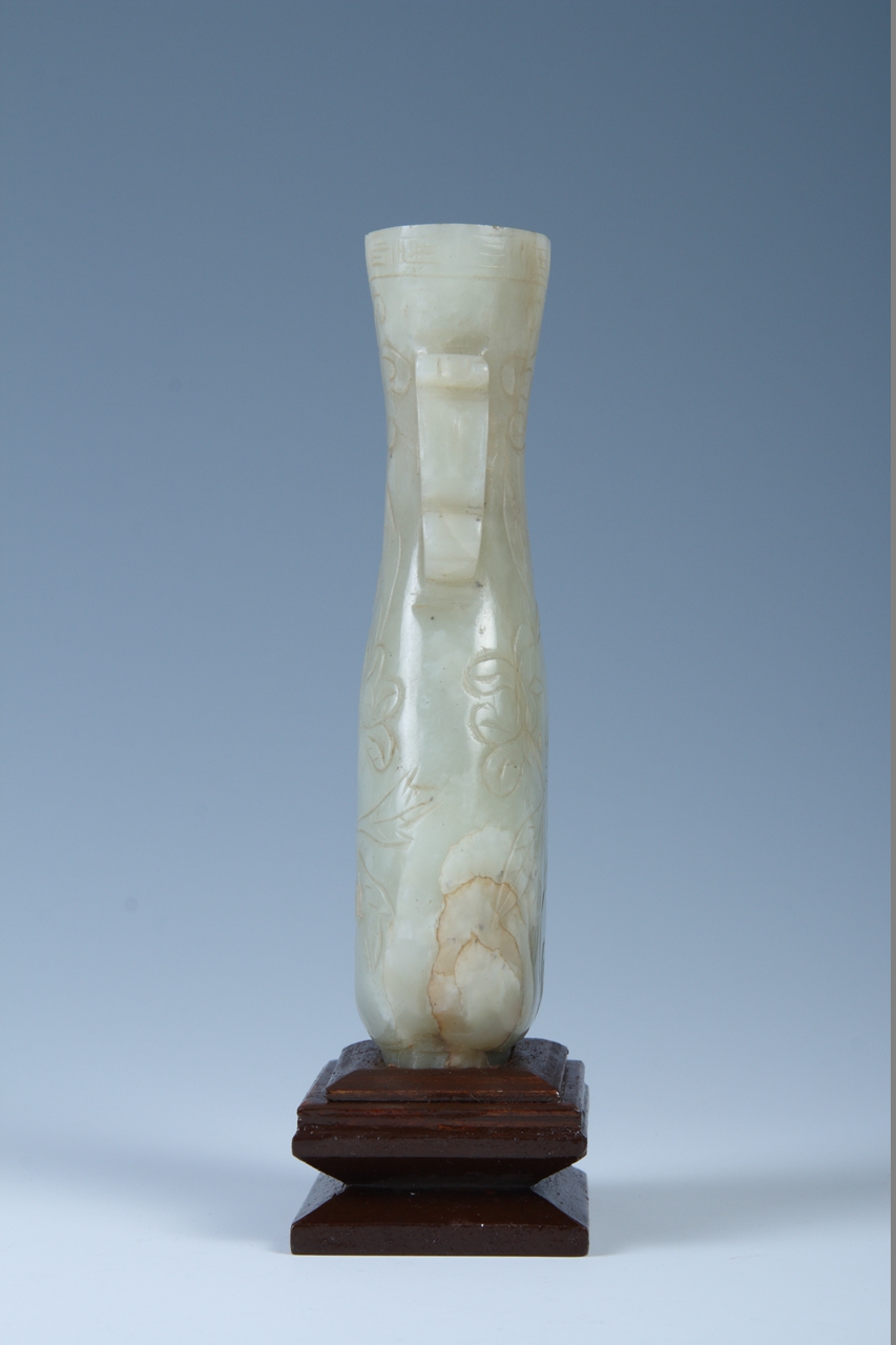 玉瓶长颈,垂腹。口沿饰一周回纹;颈部刻有灵芝,两侧透雕龙形双耳;腹部一面刻葵花,另一面刻山石、牡丹。器壁较厚,刀工较为粗率,线条棱角分明,具有明代玉器制作风格。