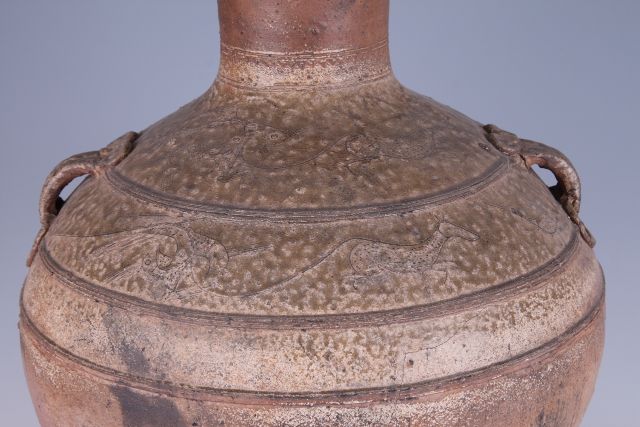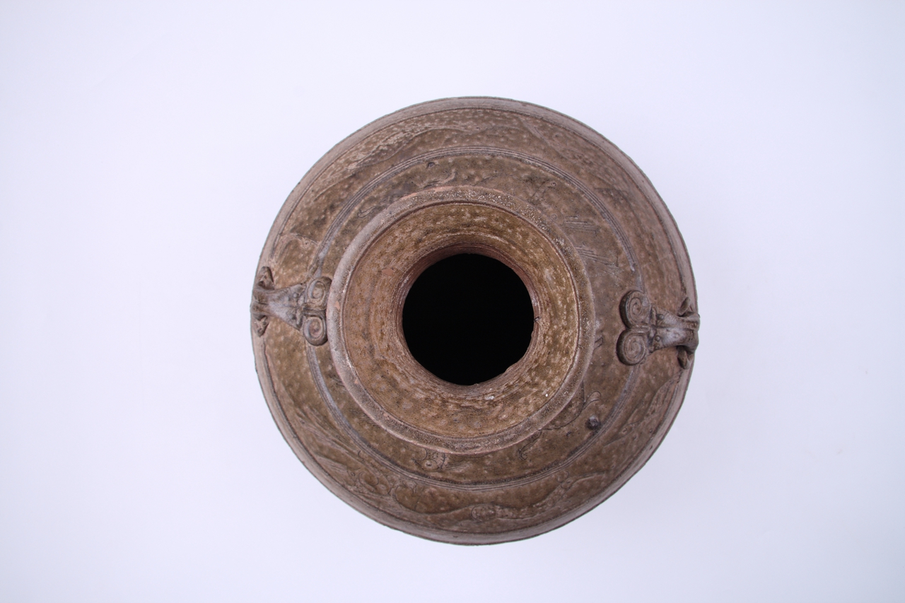 撇口,短直颈,鼓腹,平底。青灰色釉仅施至腹中部,腹下部露胎处呈红褐色,胎质坚硬。肩部饰两对称桥形耳,并各附一环。外口沿与颈部饰有两组水波纹装饰带,肩部刻划两周神兽纹,以三组弦纹相间。