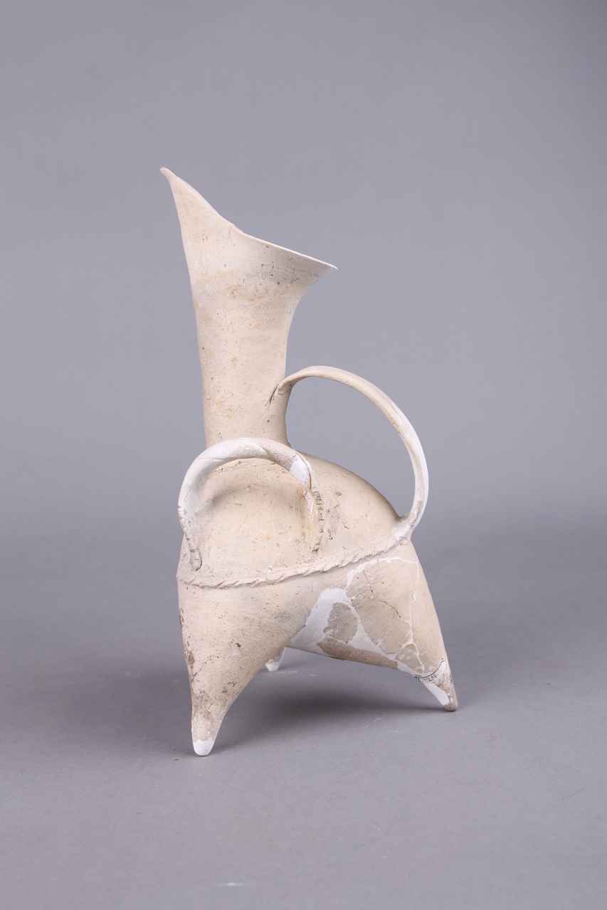泥质白陶。喇叭形口,鸟喙形流,长颈,袋状三足。腹部与袋足连接处捏有一周绳纽状堆纹。鬶腹一侧附有一鋬。该鬶出土于胶州三里河遗址,为大汶口文化典型器物。