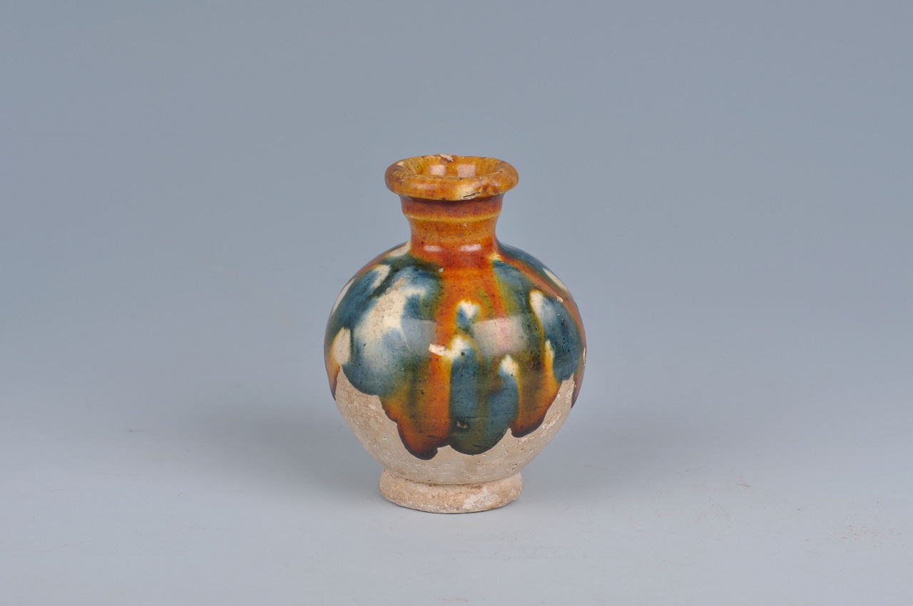 唇口,短颈,圆鼓腹,平底实足。器身施釉不到底,露胎处呈灰白色。其釉色褐、绿、蓝、白相间,色彩斑斓,相生相融。唐三彩以带蓝彩者最为珍贵。