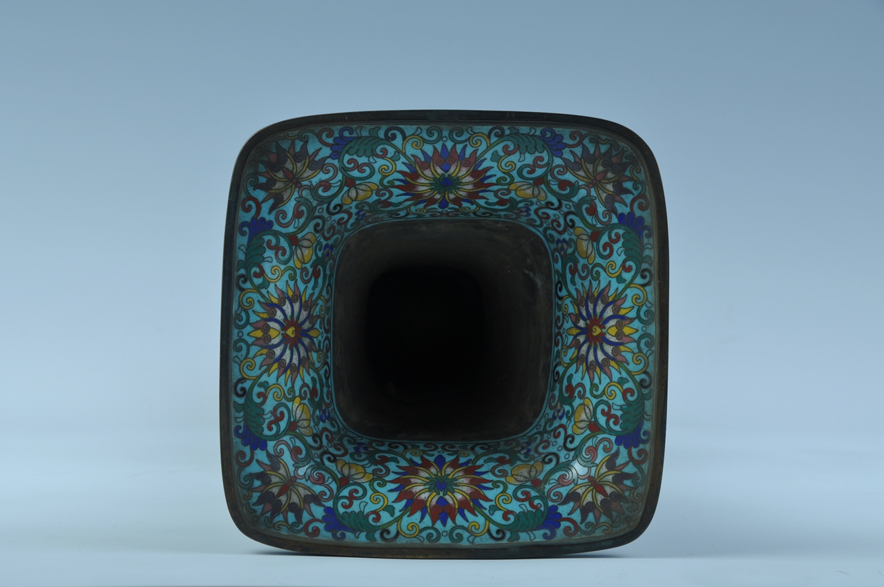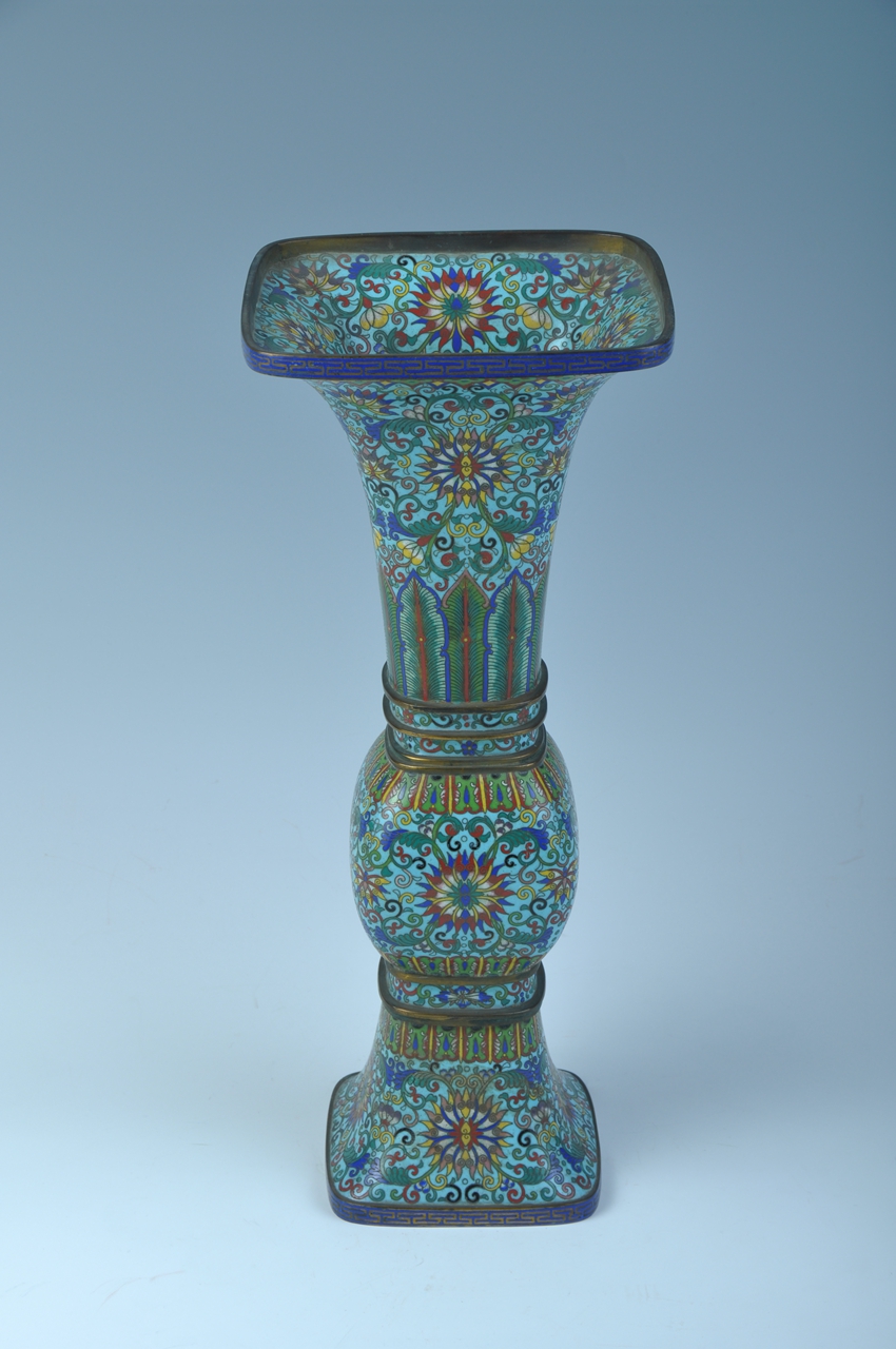 觚为铜胎镀金,仿古形制,倒喇叭形长颈,直口。通体蓝色珐琅釉上掐丝填彩西蕃莲及蕉叶纹图案,釉色纯正,掐丝规整。
