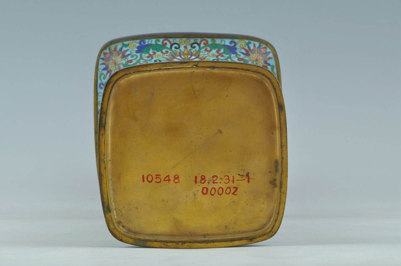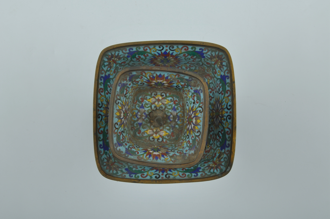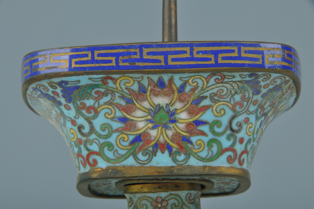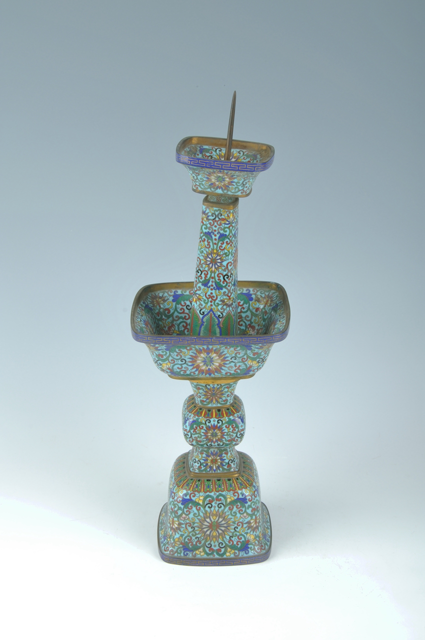 烛台铜胎镀金,呈双盘连座式。盘、座均为方形。通体蓝色珐琅釉上掐丝填彩缠枝西蕃莲及蕉叶纹图案,花纹精致,釉色鲜亮。