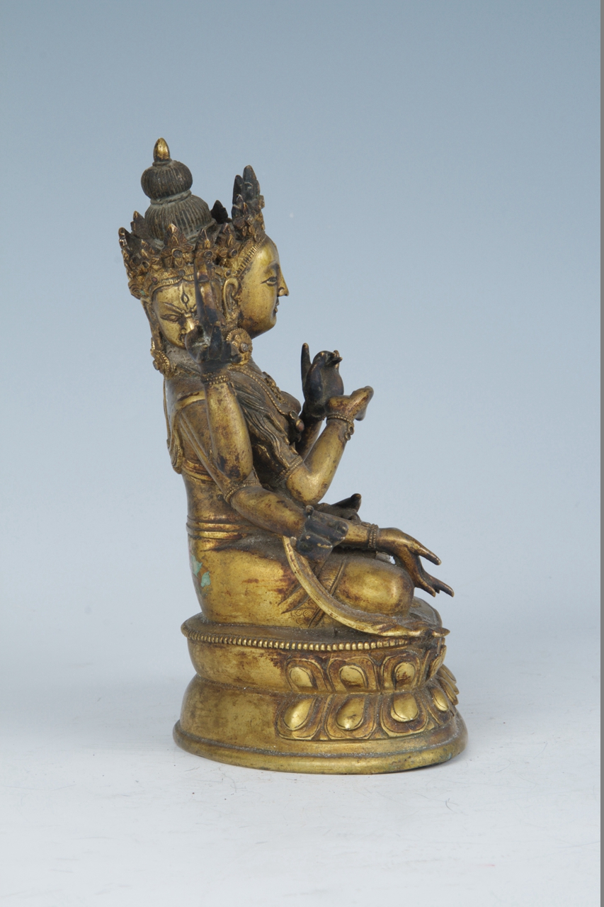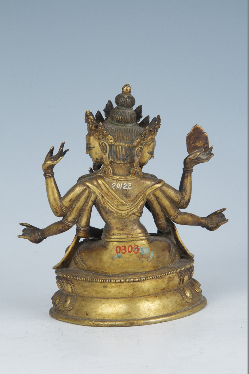 通体鎏金。观音三面,头戴宝冠,束葫芦形高髻,面相清雅静穆,双耳垂珰。八臂,胸前二手施说法印,左右六手或结法界定印,或施与愿印,或手托化佛。胸饰璎珞,腕、臂、足饰宝钏,肩披帛带,自臂缠绕,下身穿贴身罗裙,裙边錾刻有精细的莲叶纹带。两腿结跏趺坐于莲座上,莲座上沿饰联珠纹。
