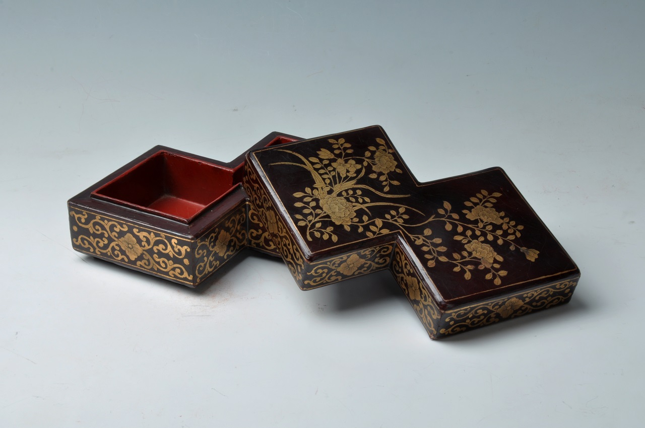 漆色黑亮,莹润如镜,盖面上描金饰有芙蓉、水仙花卉,盒盖两侧描金花卉。有雍容华贵、金碧辉煌之感,及浓厚的宫廷气韵,是雍正或乾隆时期黑漆描金器的精品。