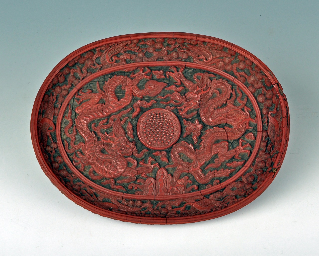 椭圆形、弧壁、平底、圈足。盘面髹朱漆,开光内雕锦地,回文代表天空,波纹代表水面,盘心雕双龙戏珠纹,下饰海水江崖。盘壁锦地上雕松枝仙鹤,寓意六合同春。底髹黑漆,正中刀刻填金“大明嘉靖年制”楷书直款,明代宫廷御制漆器。