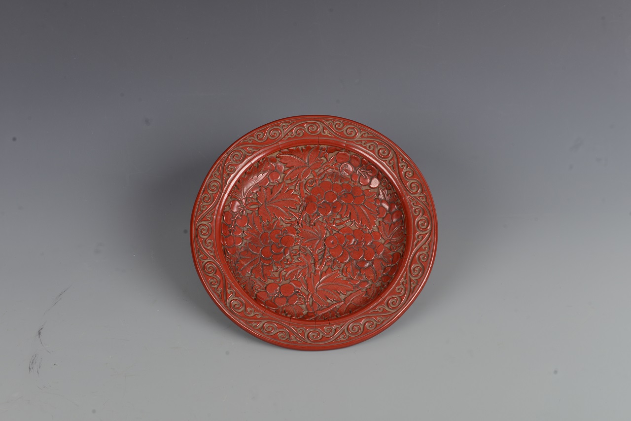 髹肥厚、油润质感朱漆,足内髹黑漆。盘心雕葡萄枝叶纹饰,藤蔓卷曲、叶片舒展、葡萄晶莹饱满,口沿刻卷草纹,底部饰莲瓣纹与卷草纹,盘底左侧竖刻楷书填金款“大明宣德年制”。相似者存世三件,实用器仅此一件。