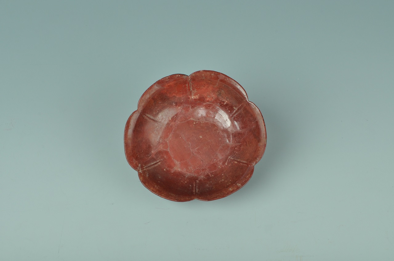 六瓣花瓣形、平底内凹。器物胎体轻薄、比例规矩匀称;器身内壁为赭色,外壁为黑褐色。造型精致美观,轮廓线条圆润流畅,有清新淡雅、朴质无华的风格,可体现宋代漆手工业民用化的特点。