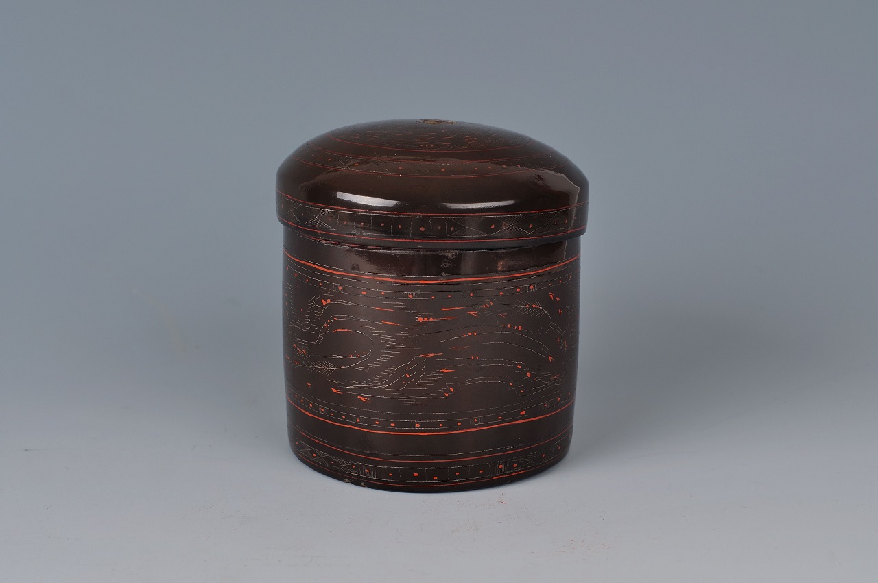 扁圆盖,圆筒腹,平底。色泽光亮,里髹红漆,外髹黑漆。器盖和器身锥画弦纹、几何纹,朱漆勾点两只奔走异兽和麦穗纹,线条流畅、纹样细致、画面醒目,是一件不可多得的佳品。