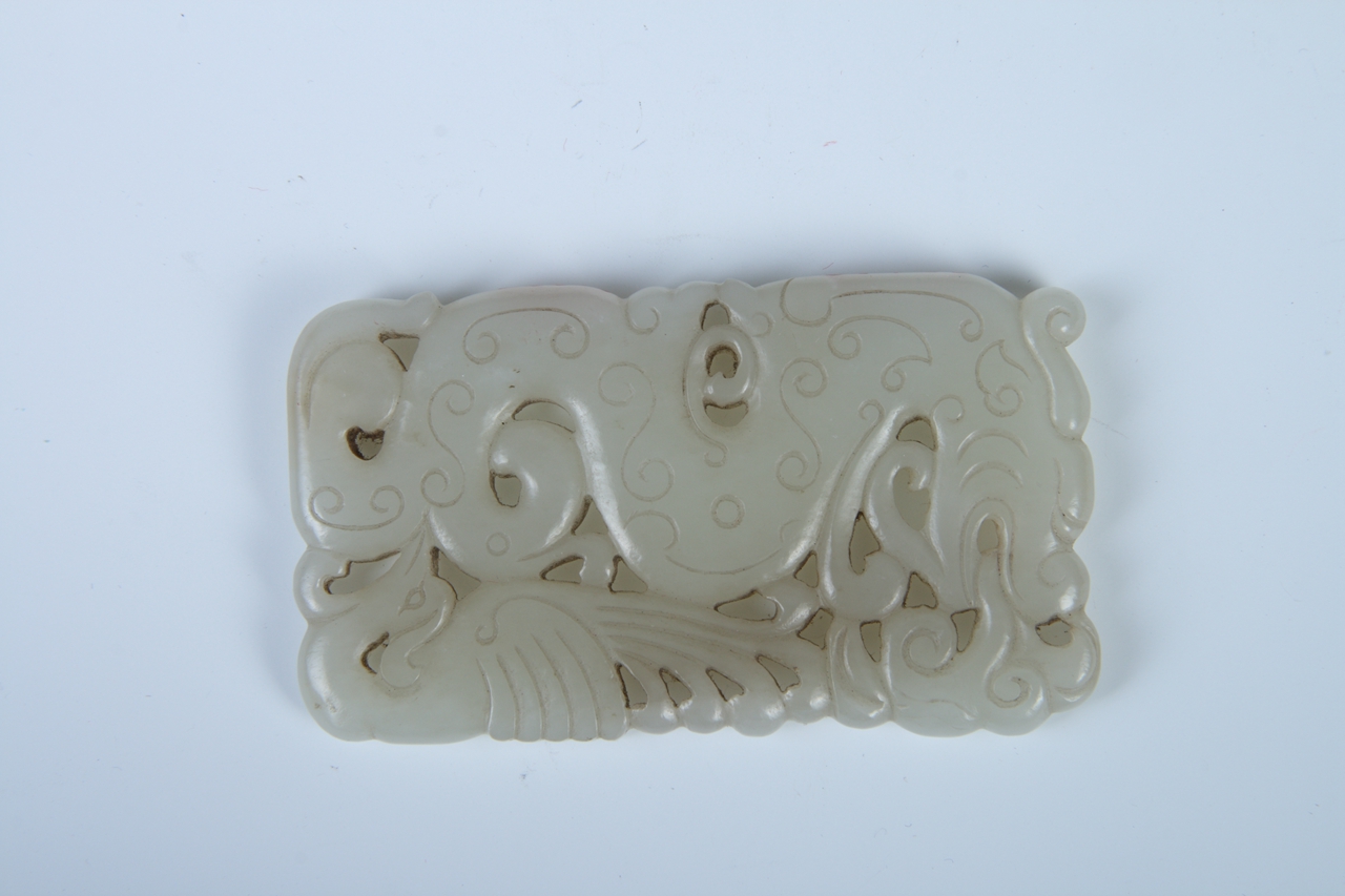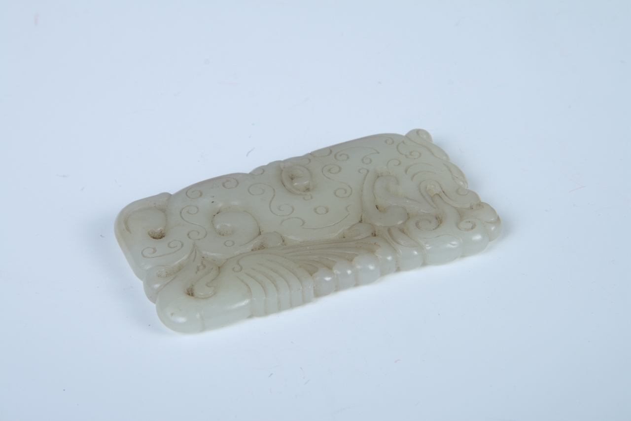 配饰。器呈扁长方形,以镂空技法双面雕刻龙凤图案。龙身弯曲盘旋,口衔灵芝,身上阴刻蟠虺纹;凤喙部与龙纹相连,凤眼、冠与翅膀、尾羽雕刻清晰。整器雕琢姿态优美,生动传神,寓意吉祥。