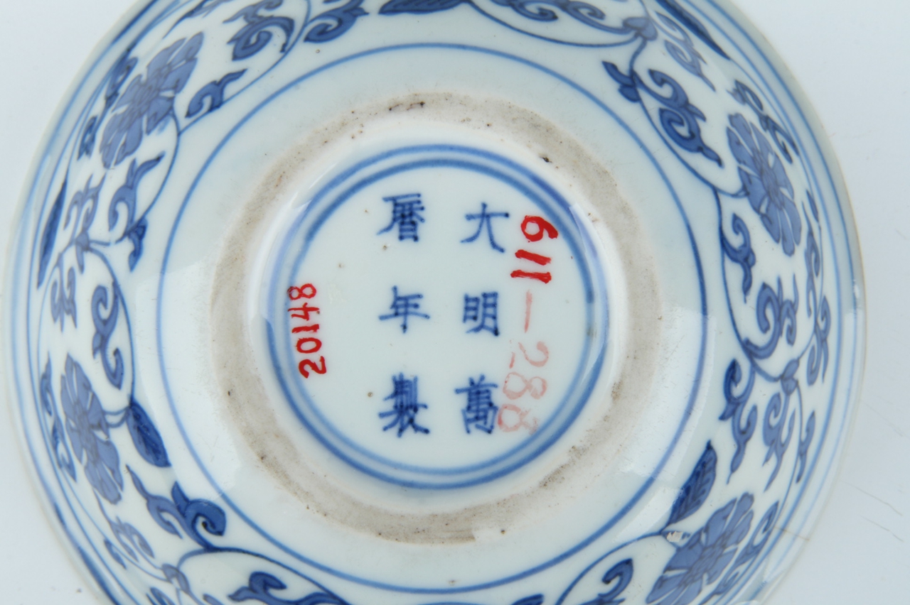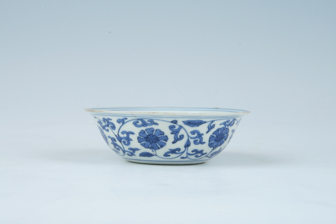 敞口,浅腹,卧足。通体以白釉青花为饰,胎体轻薄,青花色泽浓艳明快,纹饰勾画稚拙清晰。内外口沿均饰两道弦纹,碗内心青花双圈内绘缠枝莲纹,外壁腹部绘六组缠枝莲为主题纹饰,卧足内青花双圈里书有“大明万历年制”六字双行款。