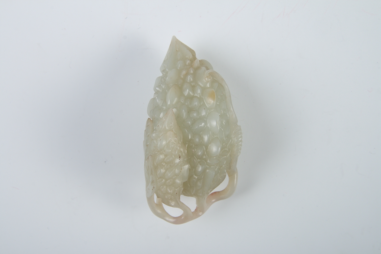 采用透雕和浮雕技法雕琢两个相连的癞瓜,果型圆润。癞瓜表皮大小不均的颗粒、自然缠绕的瓜藤等均细致刻画,蒂处透雕枝蔓。表面略有沁色似果实初熟之状,逼真自然。癞瓜因籽多而饱满,被认为有多子多福的美好寓意。