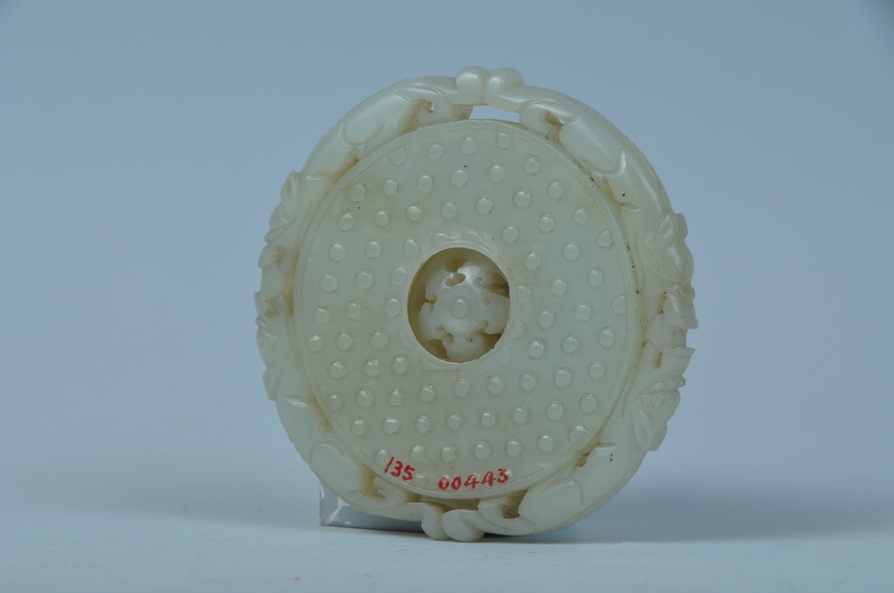 佩饰。器呈扁圆形,一面浅浮雕乳钉纹,另一面刻如意云纹,外缘出廓透雕两组双龙戏珠纹。璧好透雕五瓣花卉纹,可灵活转动。