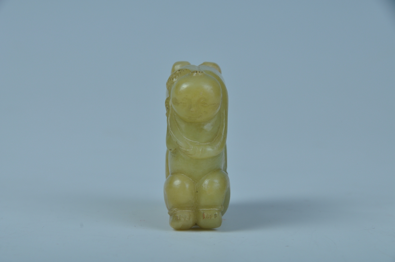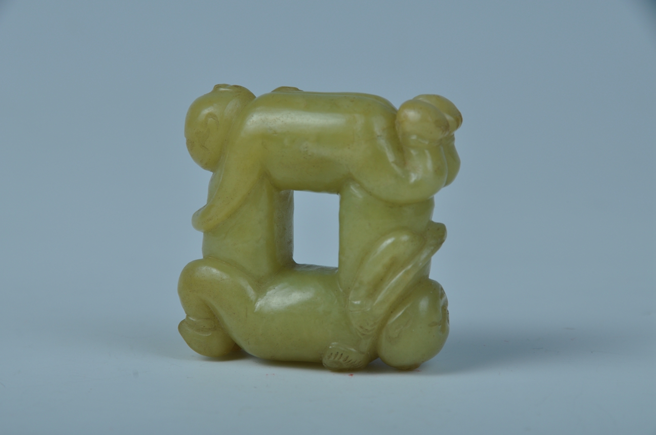 以黄玉制作,器呈方形,中空。圆雕两首四身相连童子,手持如意,浑圆可爱。