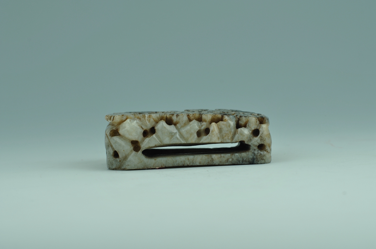 佩饰。器呈扁长方形,正面上层镂雕柞树,下层雕三只形态各异的鹿纹,侧面有两长条形穿孔,可与革带穿系。是一件典型的金代“秋山玉”作品。
