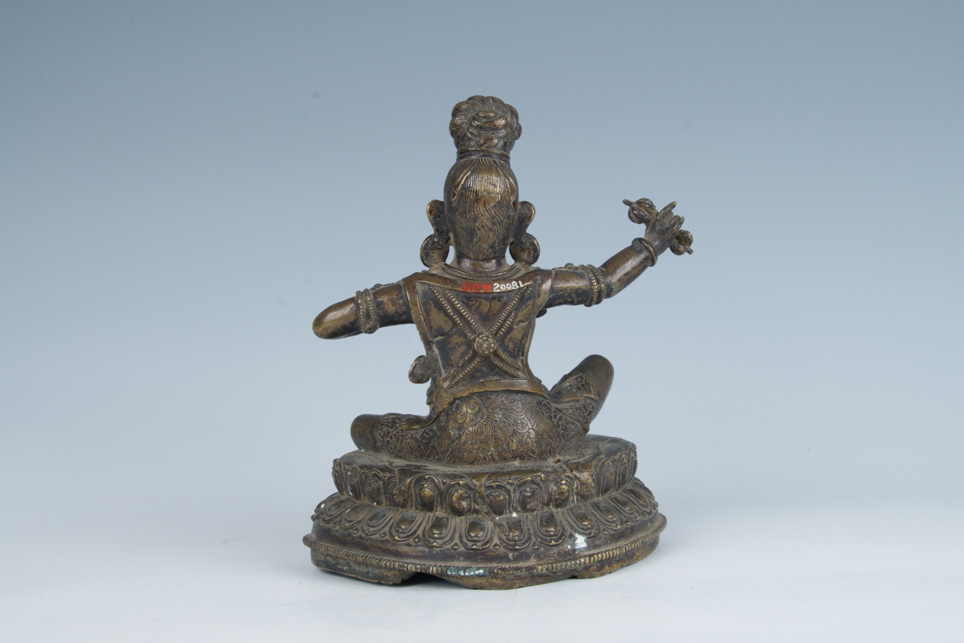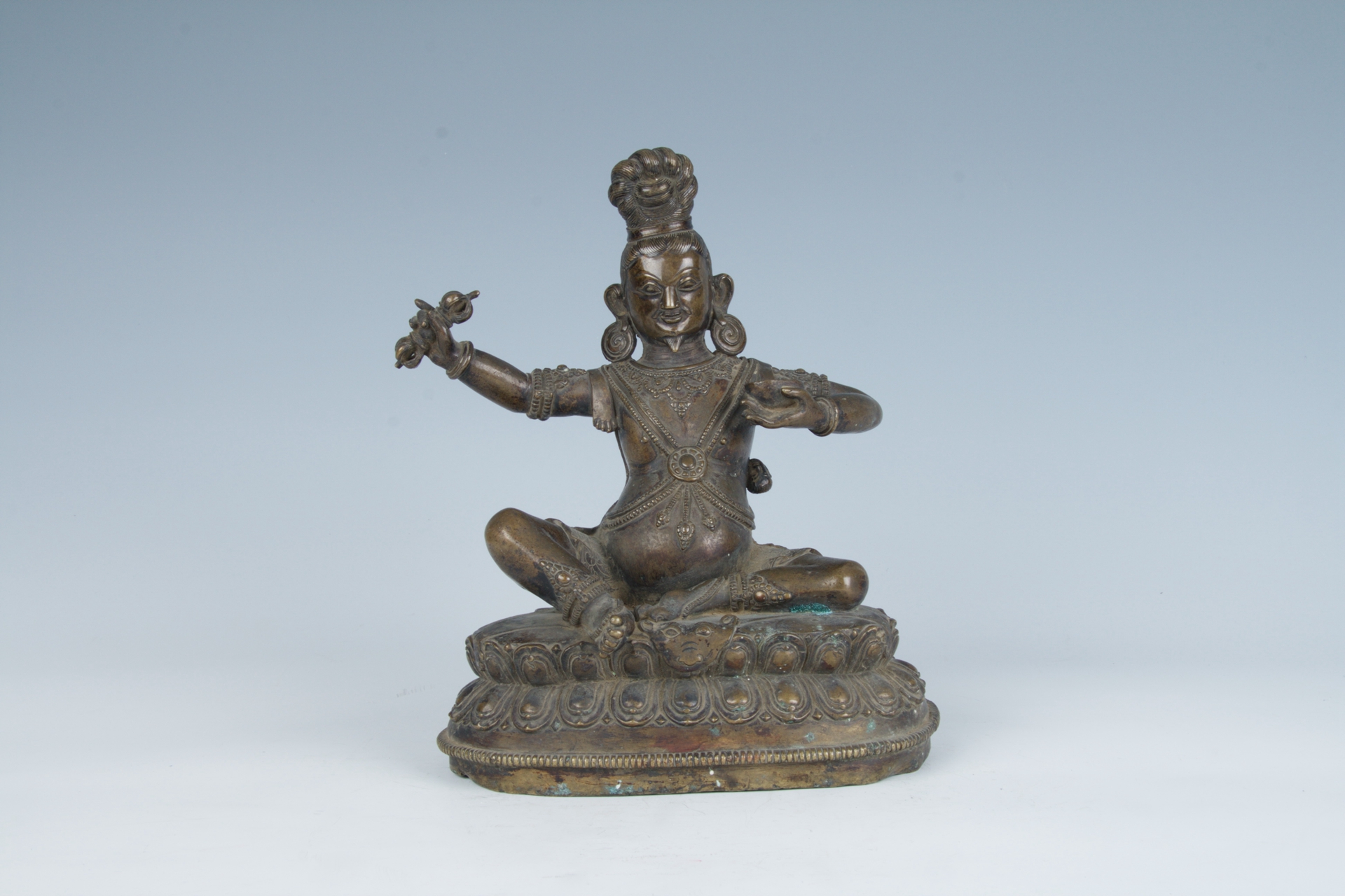 盘高长髻,长方脸,面清瘦,高鼻,二目如杏仁。面带笑容,上唇及下巴留胡,两耳佩戴涡旋状耳珰。身穿圆领短衫,两肩至胸前交叉斜披缨络。双臂佩臂钏、腕钏,右臂上举,施期克印,执金刚杵,左手于胸前捧嘎布拉碗。半跏趺坐于莲台上,莲台面铺一张兽皮。整像造型生动,刻画较为细致。