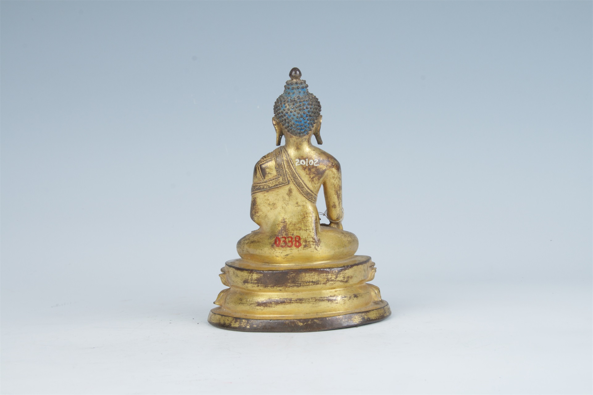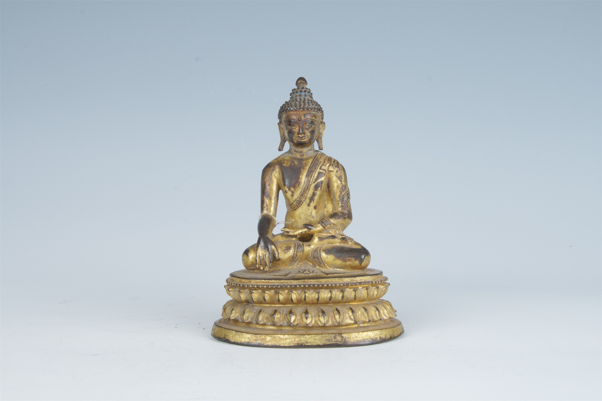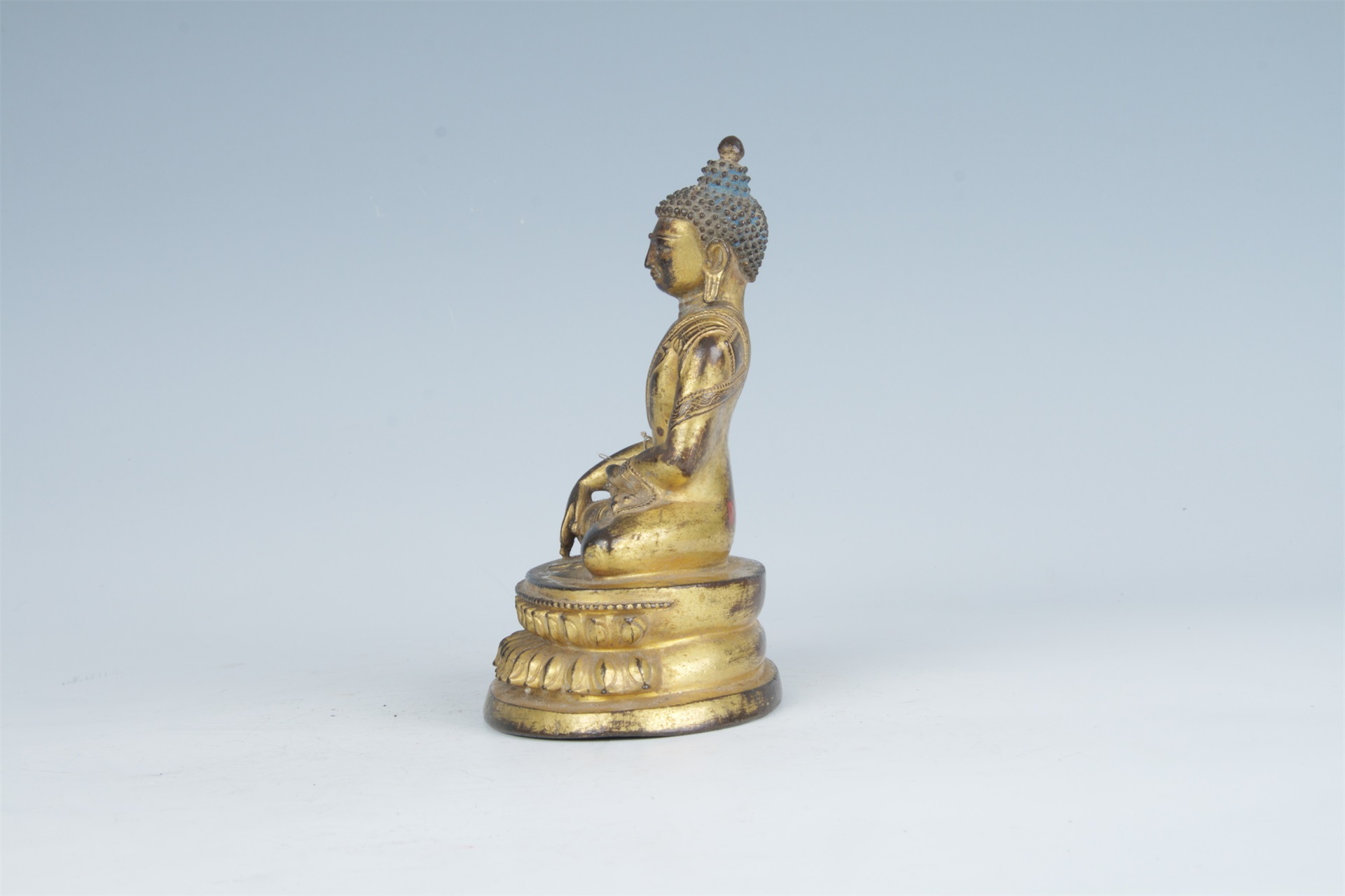 高肉髻,螺发,宽额,眉眼细长,眉间饰有白毫,两耳垂长。身穿袒右贴身天衣,衣裙边饰简单的缠枝纹和联珠纹。右手置于膝前,掌心向内,五指向下,施触地印,左手平置腹前,掌心向上,结法界定印。双腿结跏趺坐于莲台上,莲台正面满饰写实莲瓣,上沿饰一周联珠纹。有封底。通体鎏金。