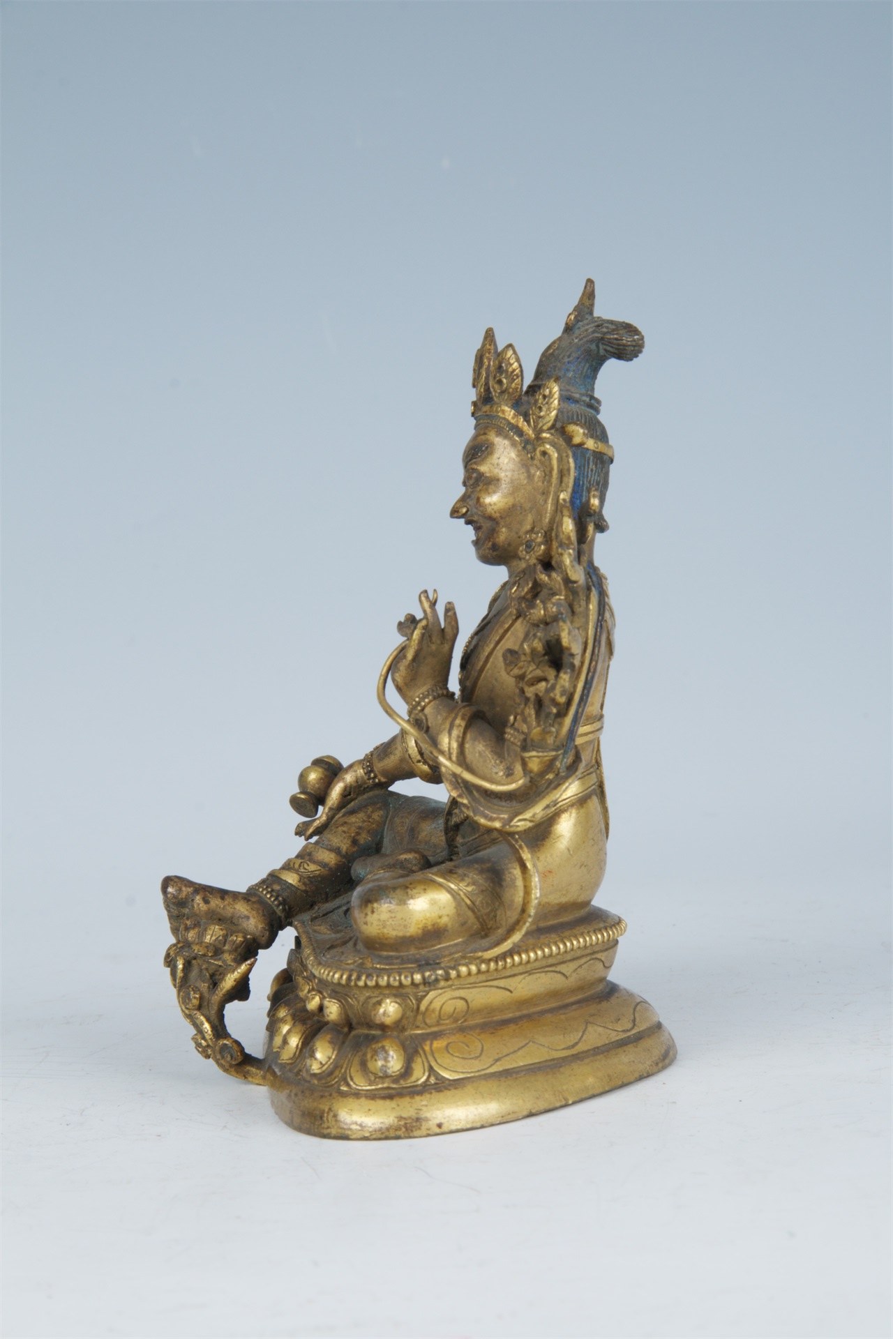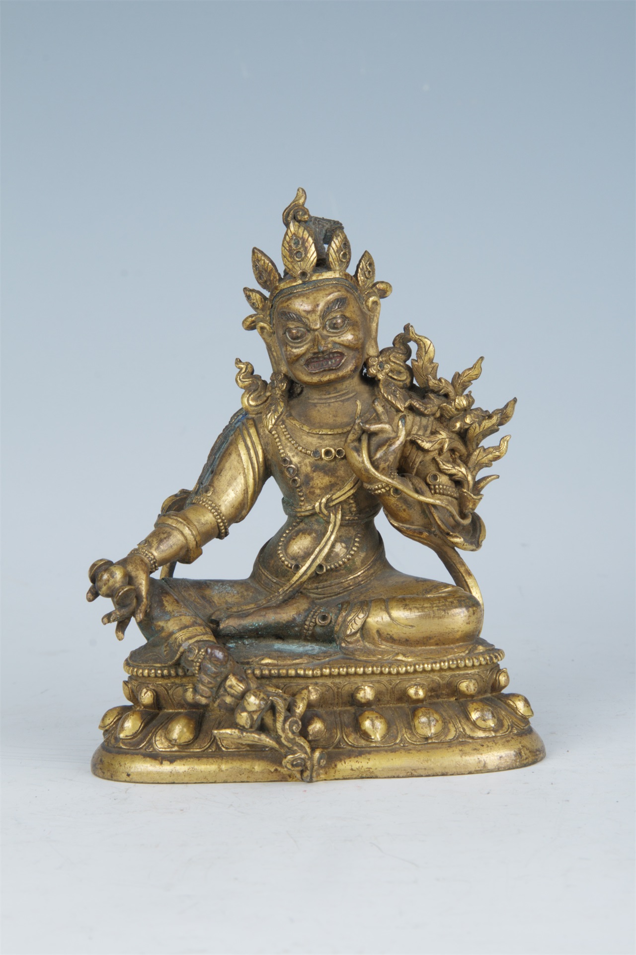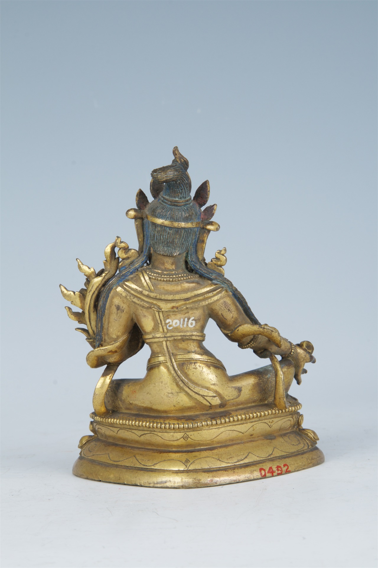 束高发髻,戴五叶宝冠。束冠缯带自耳后垂肩。方脸,宽眉,怒目圆睁,嘴大张,牙齿紧闭,佩垂叶五瓣花耳珰。身披天衣,斜系帛带。两臂、手腕及脚腕各饰两圈珠链。左臂附有一束莲花,手执其根须,右手执瓶状法物。下身着裙,游戏坐于莲台,下踏莲花。通体鎏金。