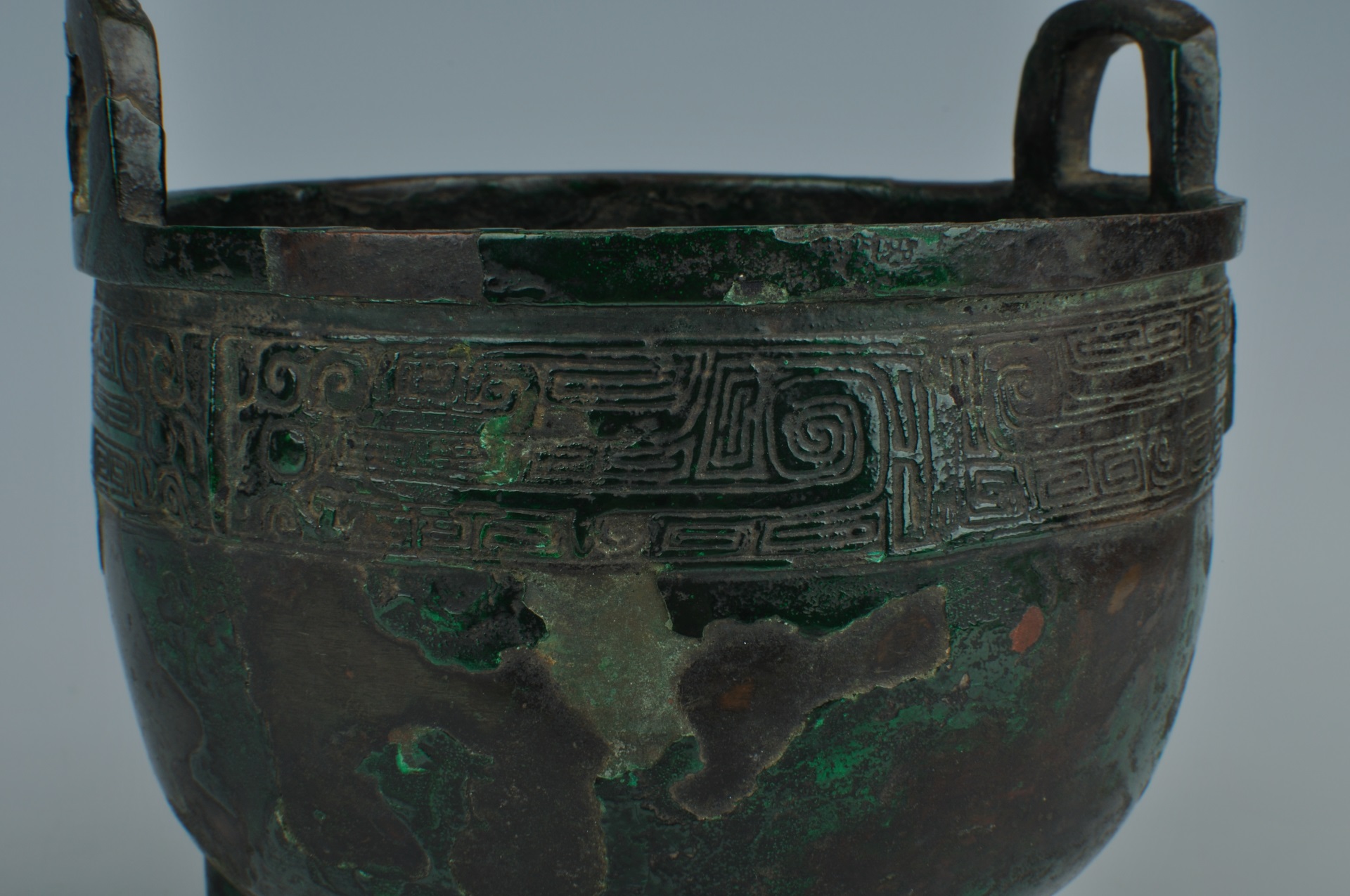 直口,方唇,双立耳,深腹圆底,柱形足,口沿下饰一周兽面夔龙纹,腹内有铭文,器制稳重。