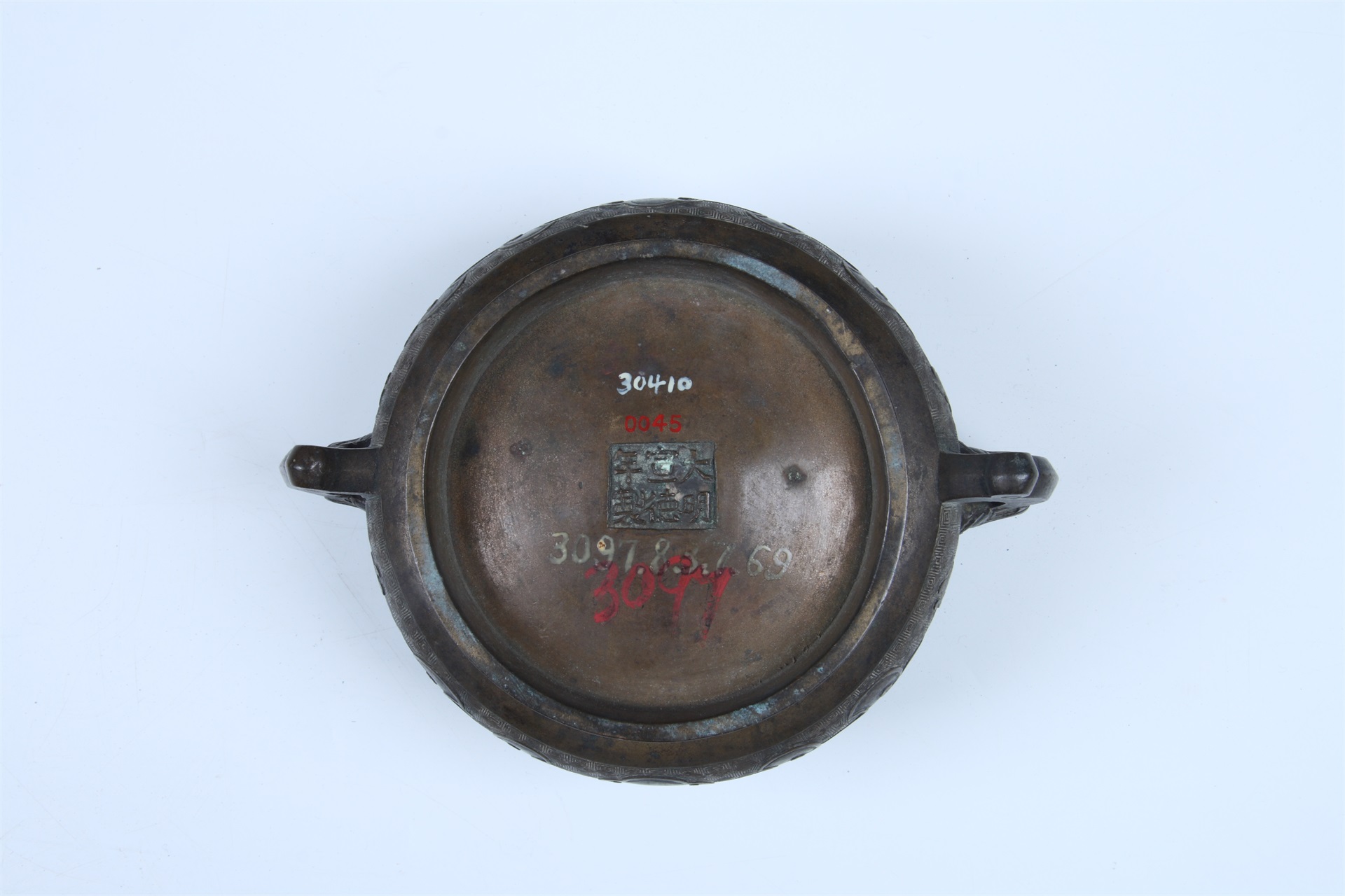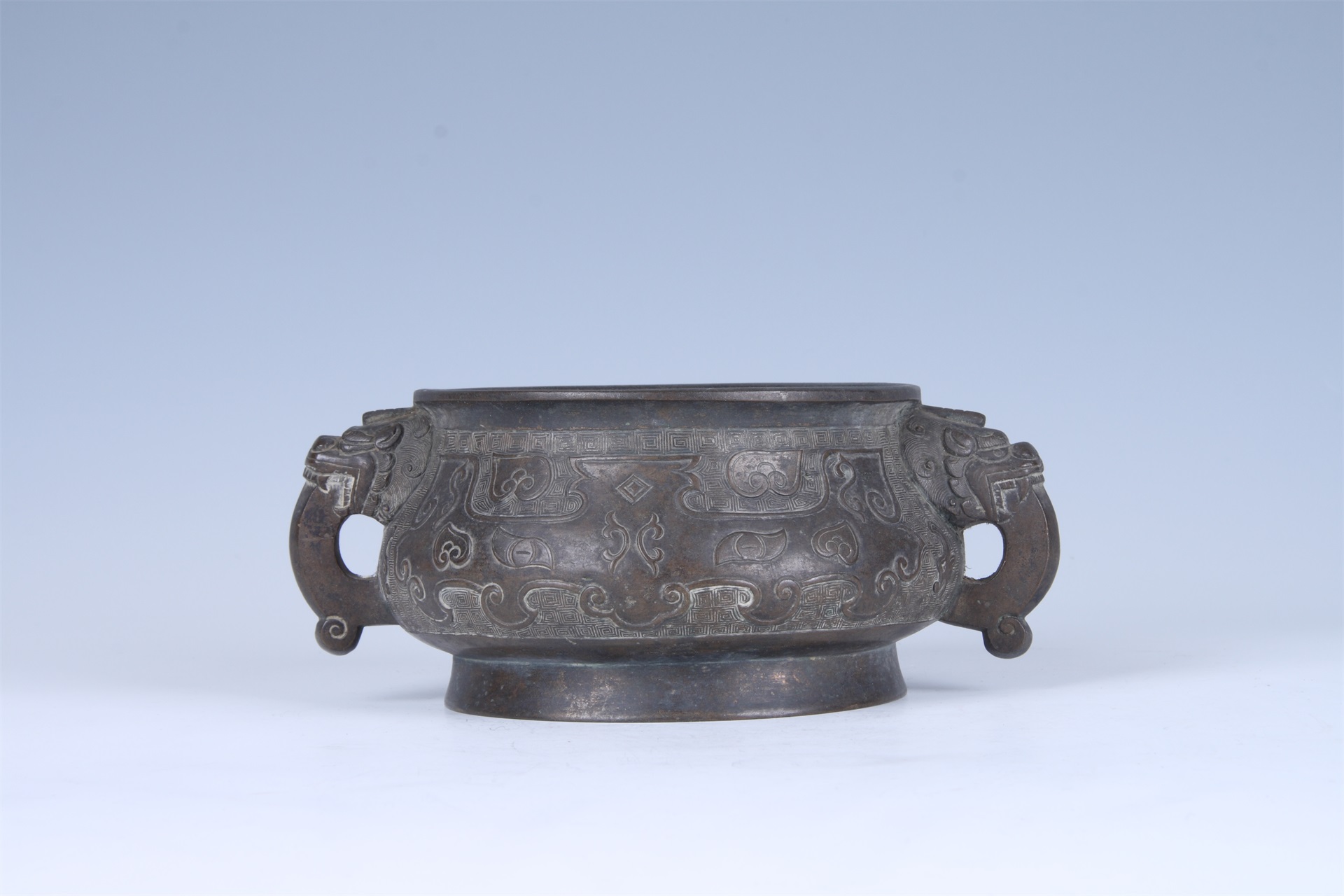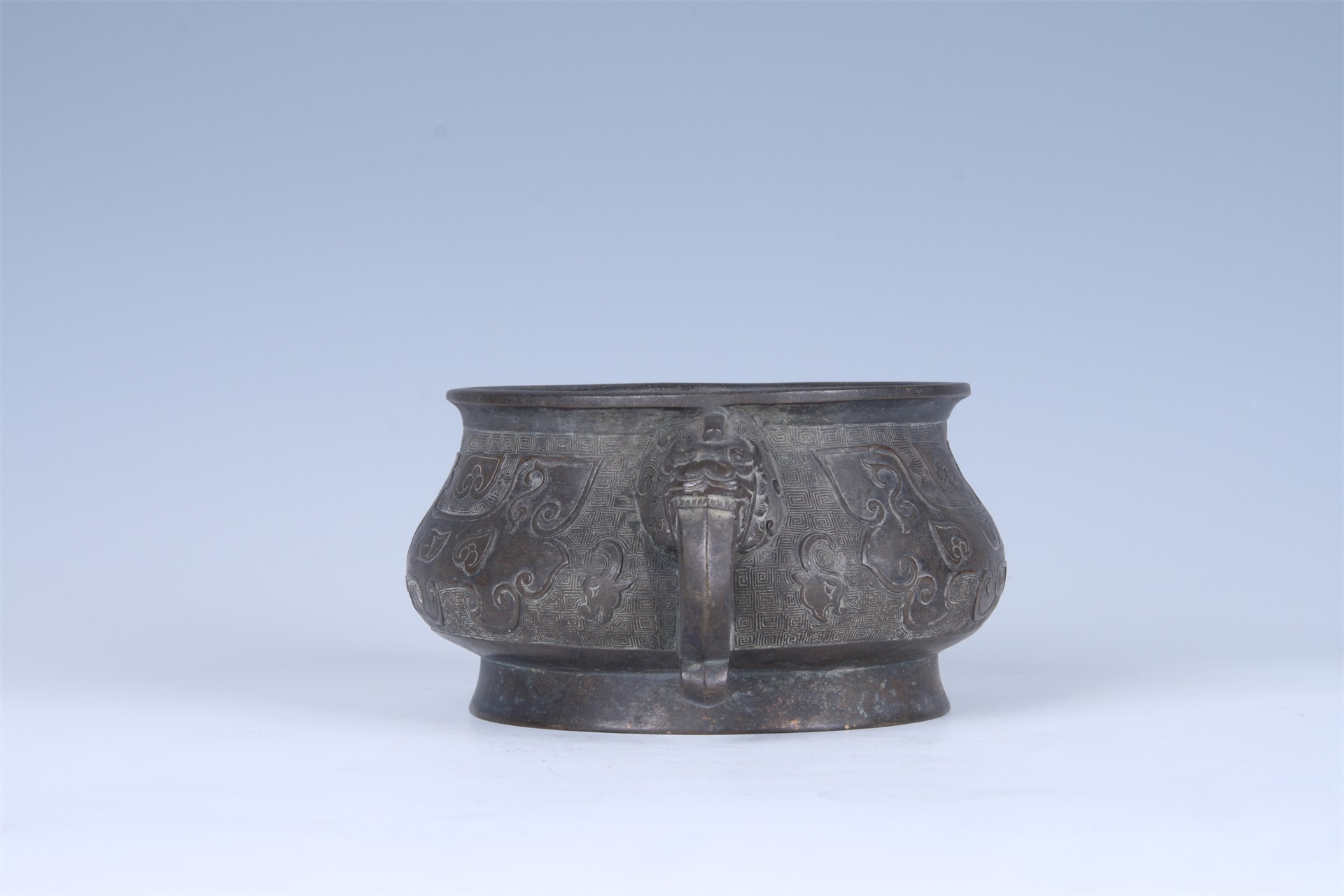 侈口,方唇,鼓垂腹,圈足。肩、腹部以雷纹作地,饰变形兽面纹。两侧饰有一对龙形耳,底铸“大明宣德年制”款。