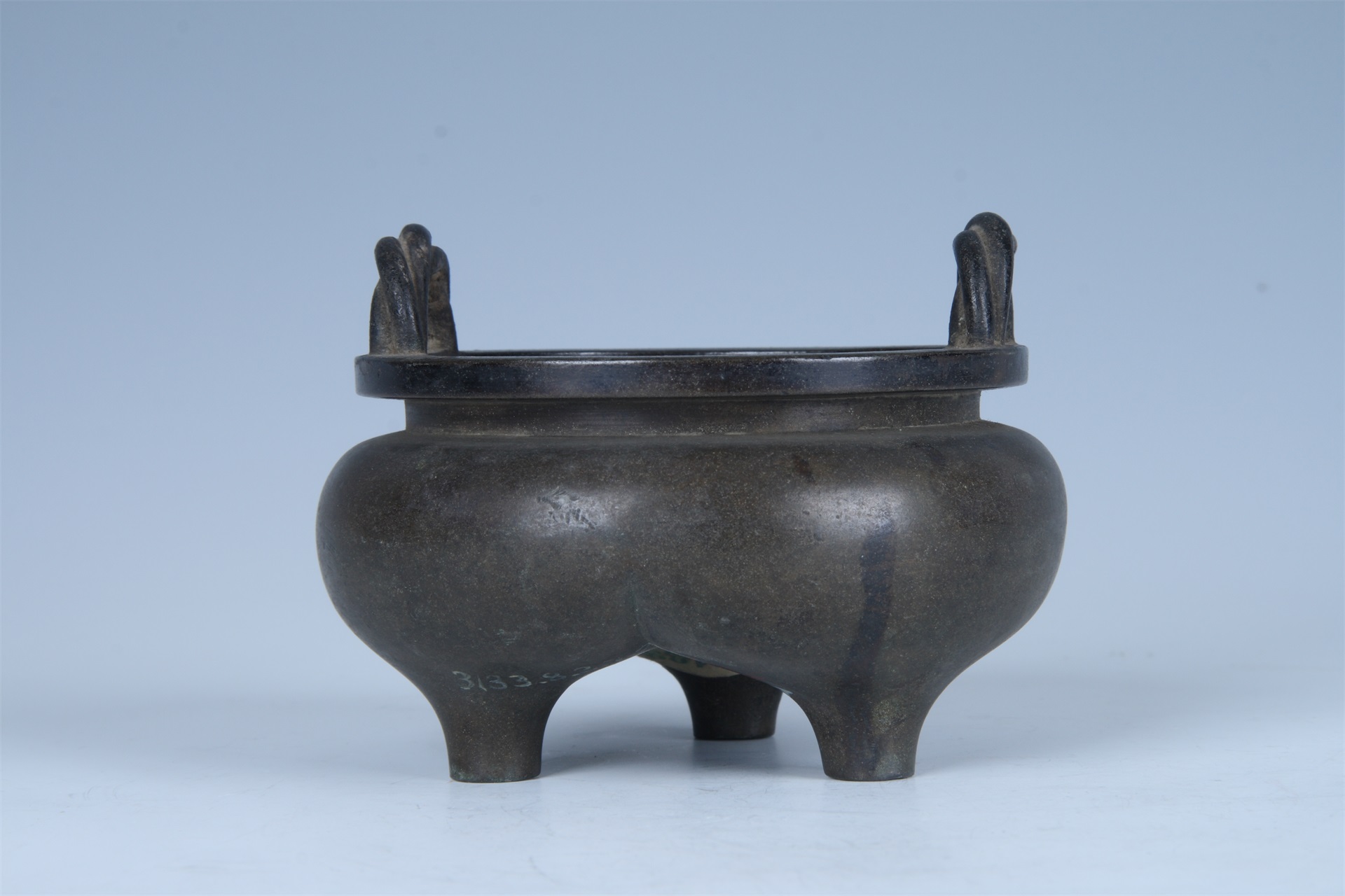 通体素面呈粟色,圆口,方唇,颈直且短,鼓腹,分裆三足,口沿上饰一对绳纽形立耳,底铸“大明宣德年制”款。
