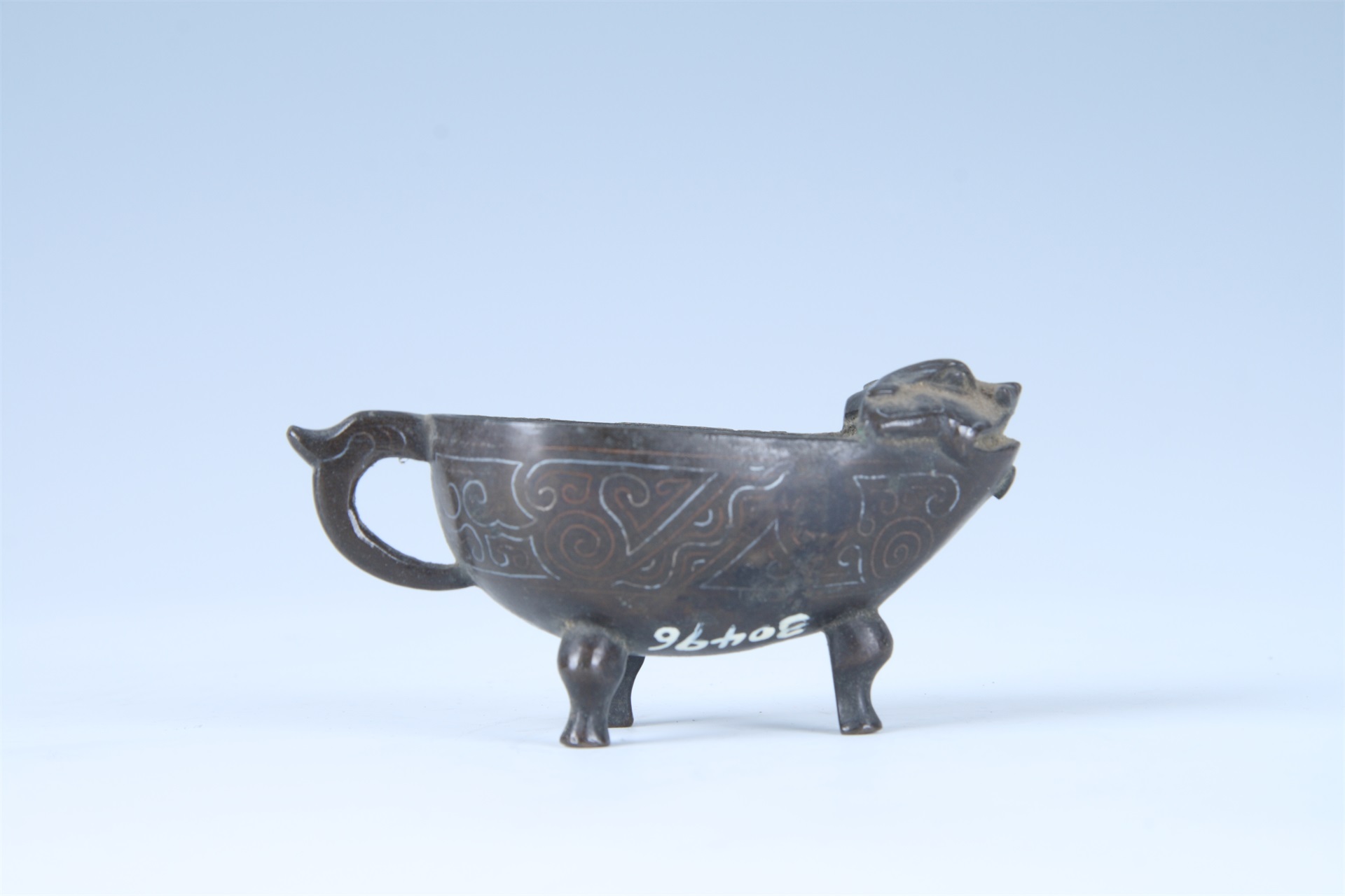 砚滴总体造型是一只瑞兽,顶部敞口,腹部中空,瑞兽嘴部设计为出水口,圆底,下接三短蹄足,瑞兽尾巴自然卷曲成耳。器身采用错金银工艺,绘有三角云纹。