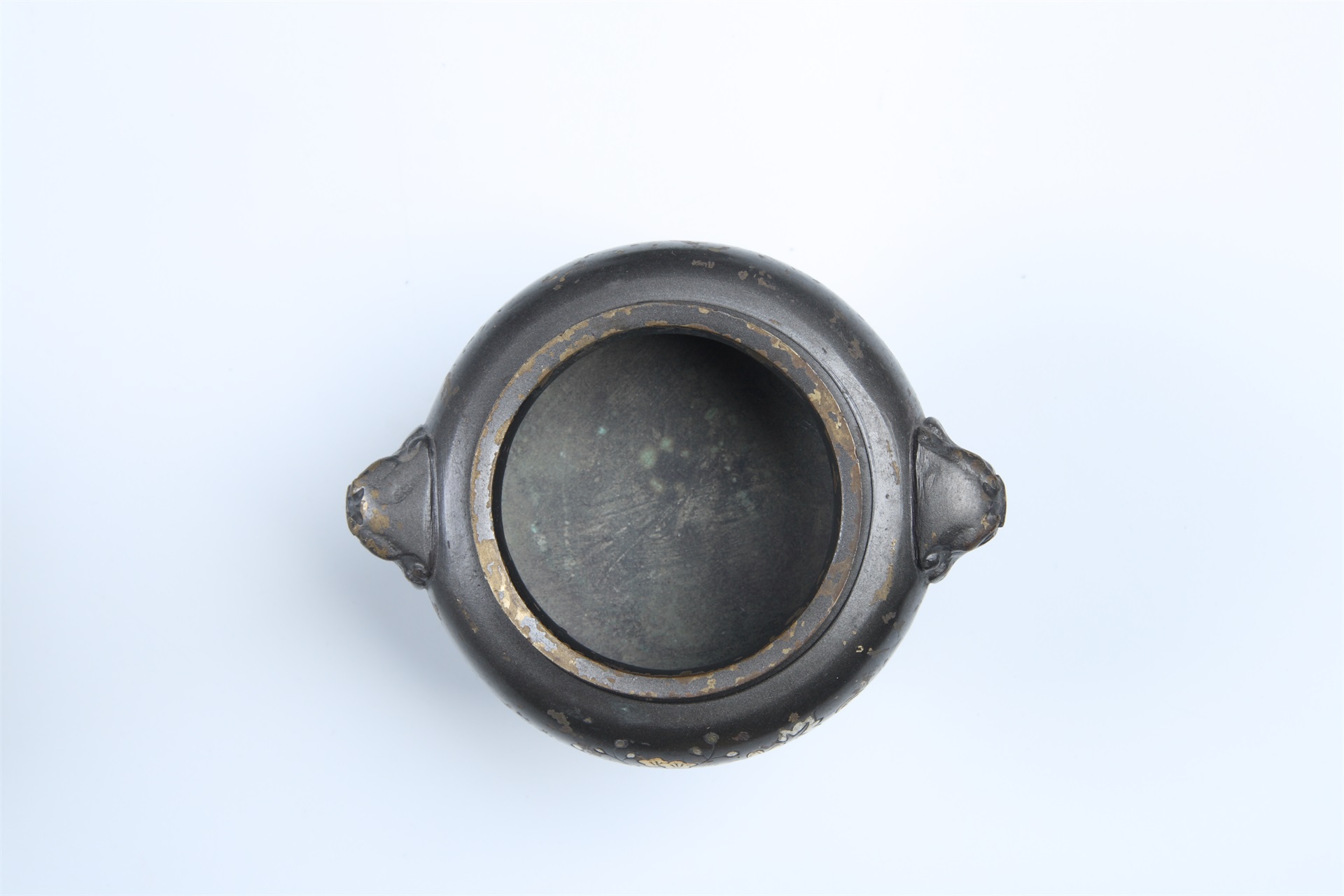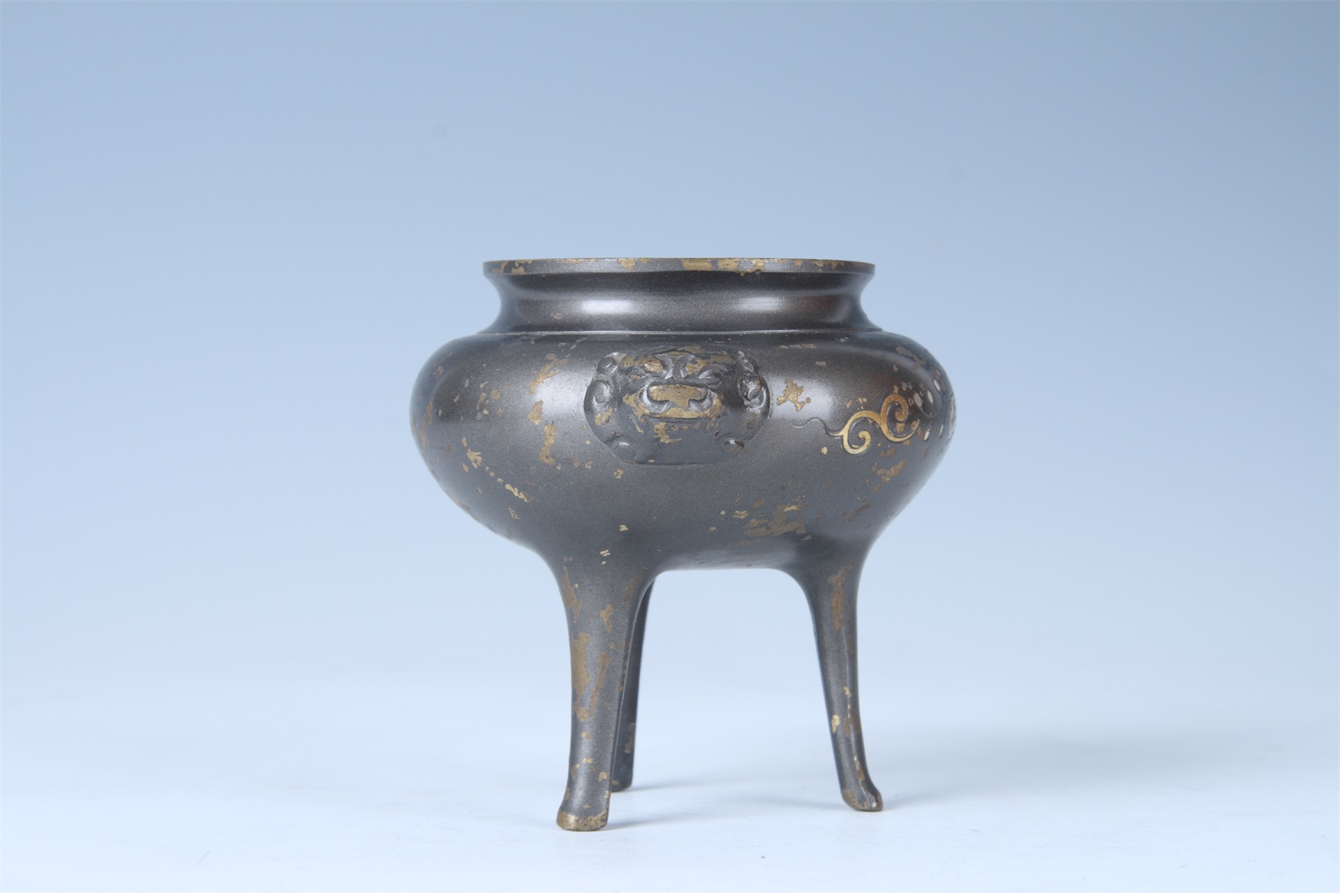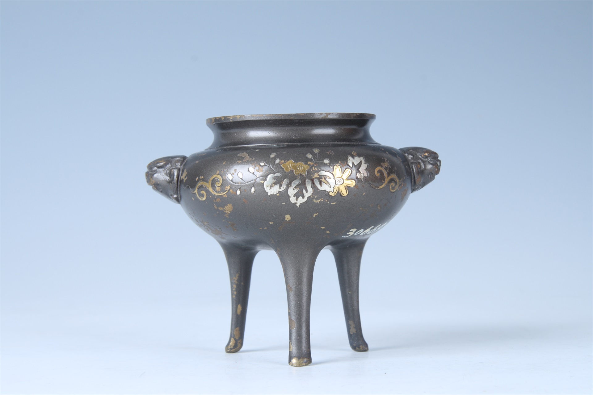 圆口平唇,束颈,扁鼓腹,腹底承三细长足。腹部两侧饰兽面耳,腹部采用嵌金银工艺,饰有折枝花卉纹。整器外壁洒金点缀,造型优美别致。
