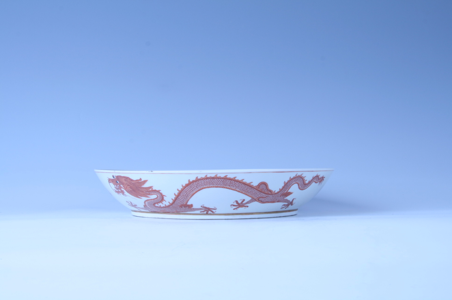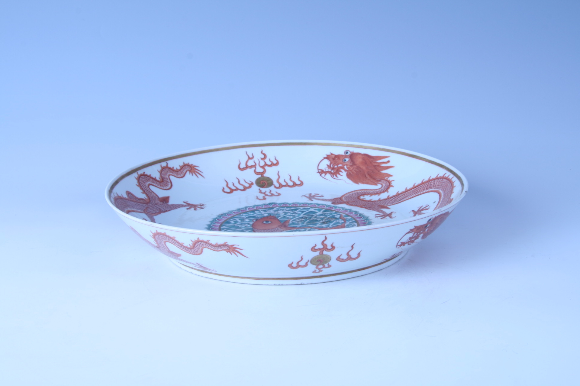 盘撇口,弧壁,浅腹,圈足。通体以白釉为地,内外壁以矾红彩绘首尾相追的双龙纹,间衬火珠。盘心绘红鲤鱼,穿游在浪涛中。所绘纹饰工整,线条流畅。盘外底中心处以青花署“大清光绪年制”竖排双行六字楷书款。